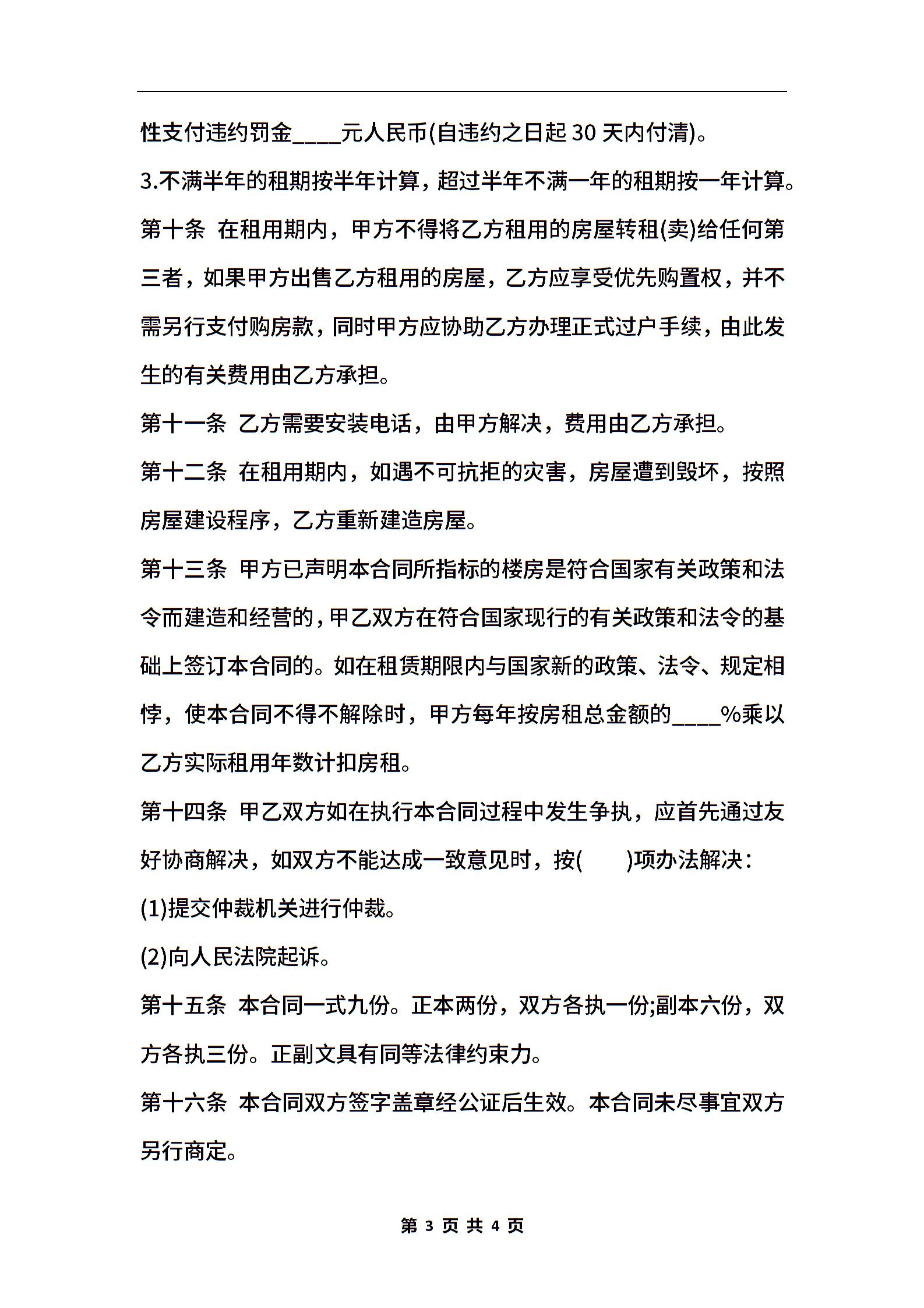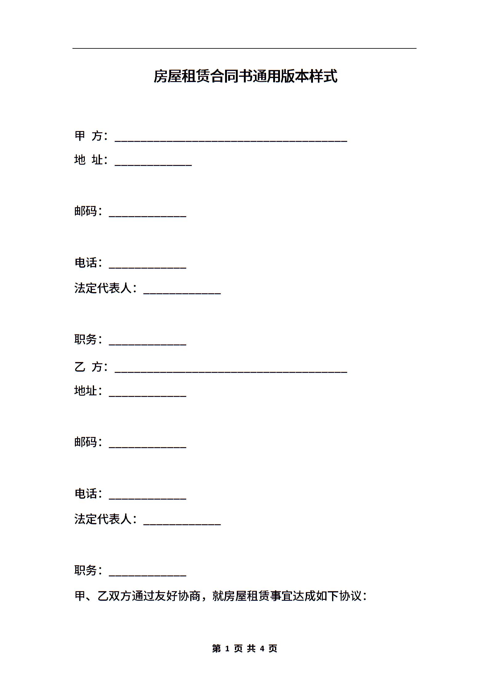 房屋租赁合同书通用版本样式