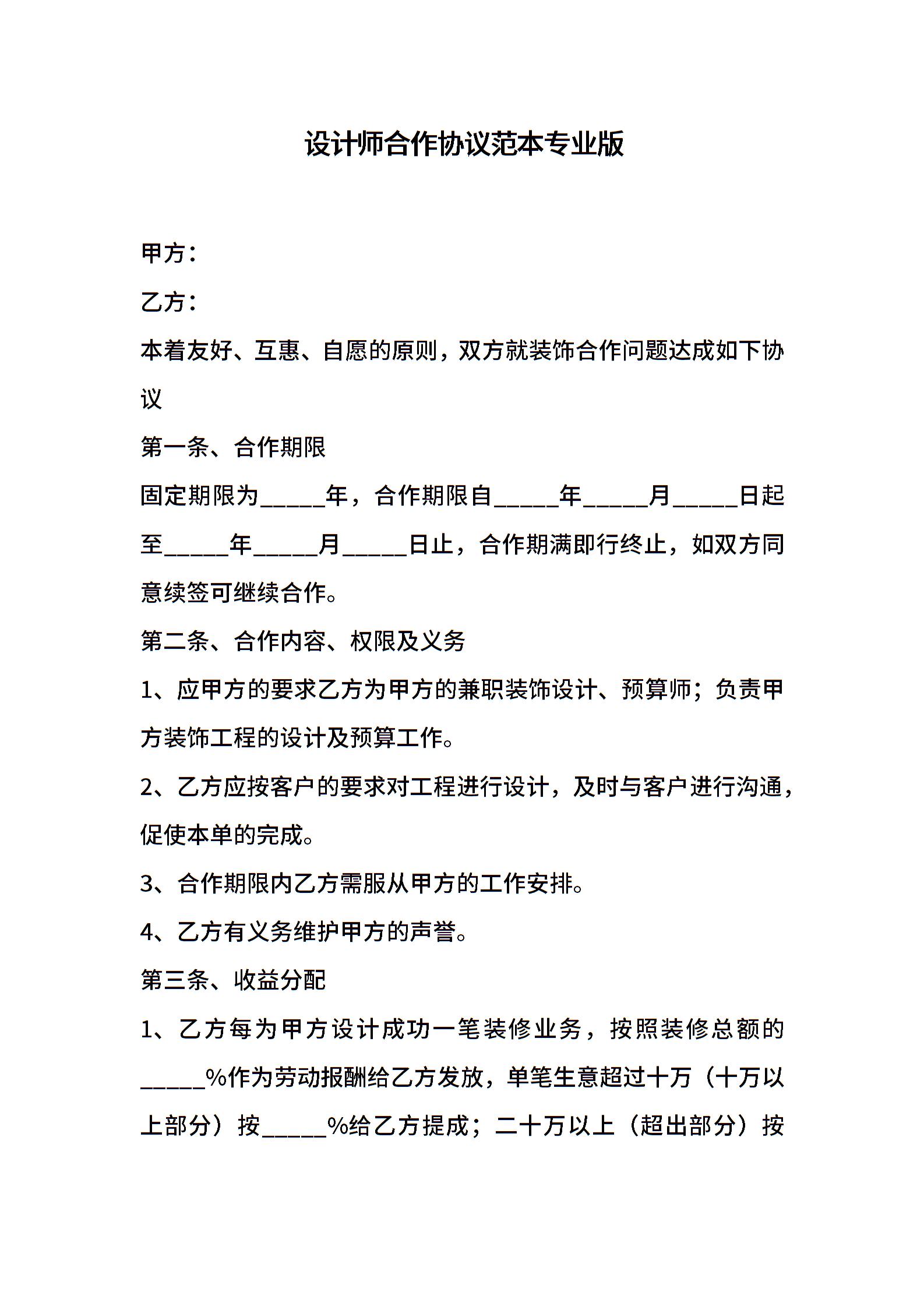 设计师合作协议范本专业版