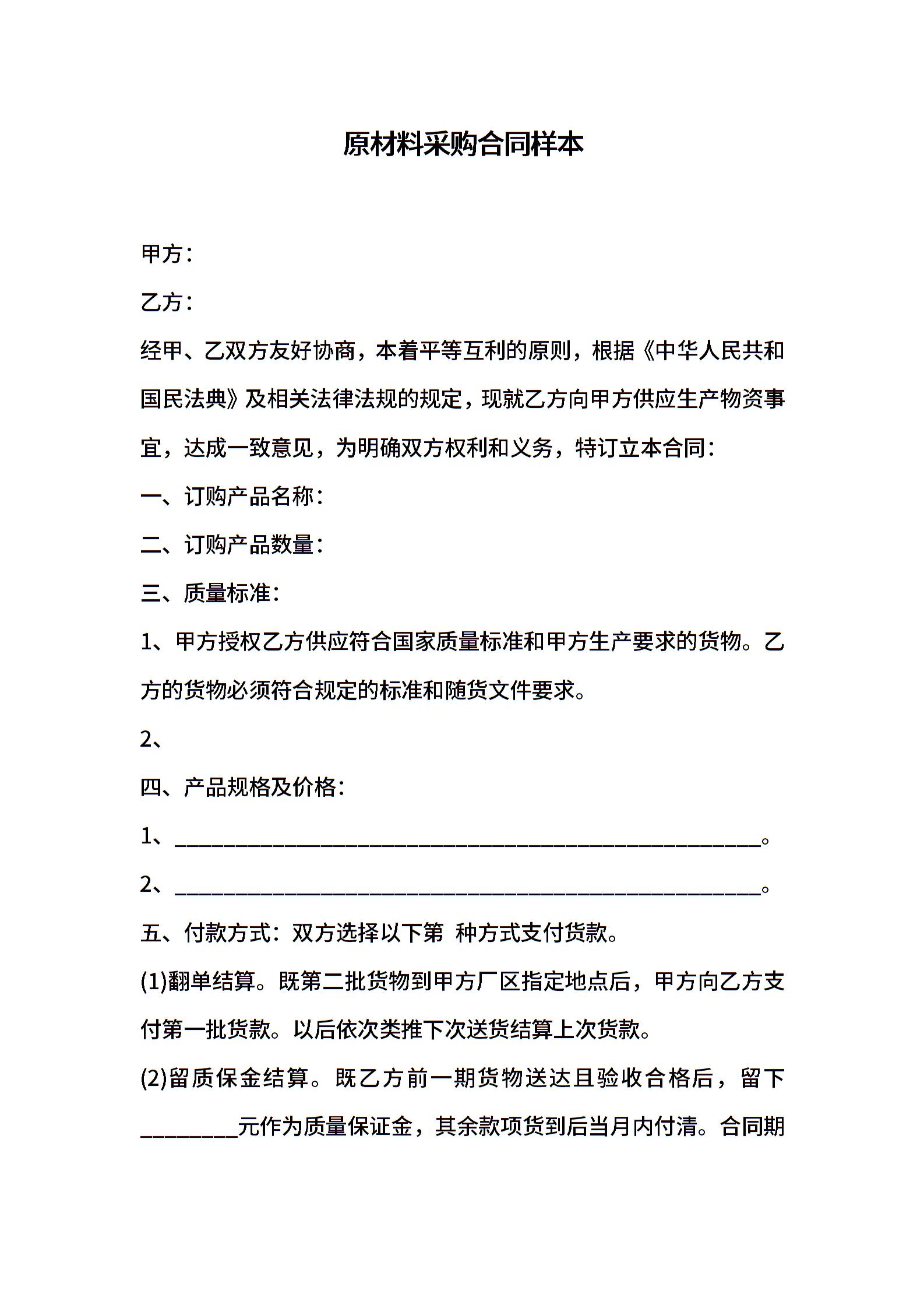 原材料采购合同样本