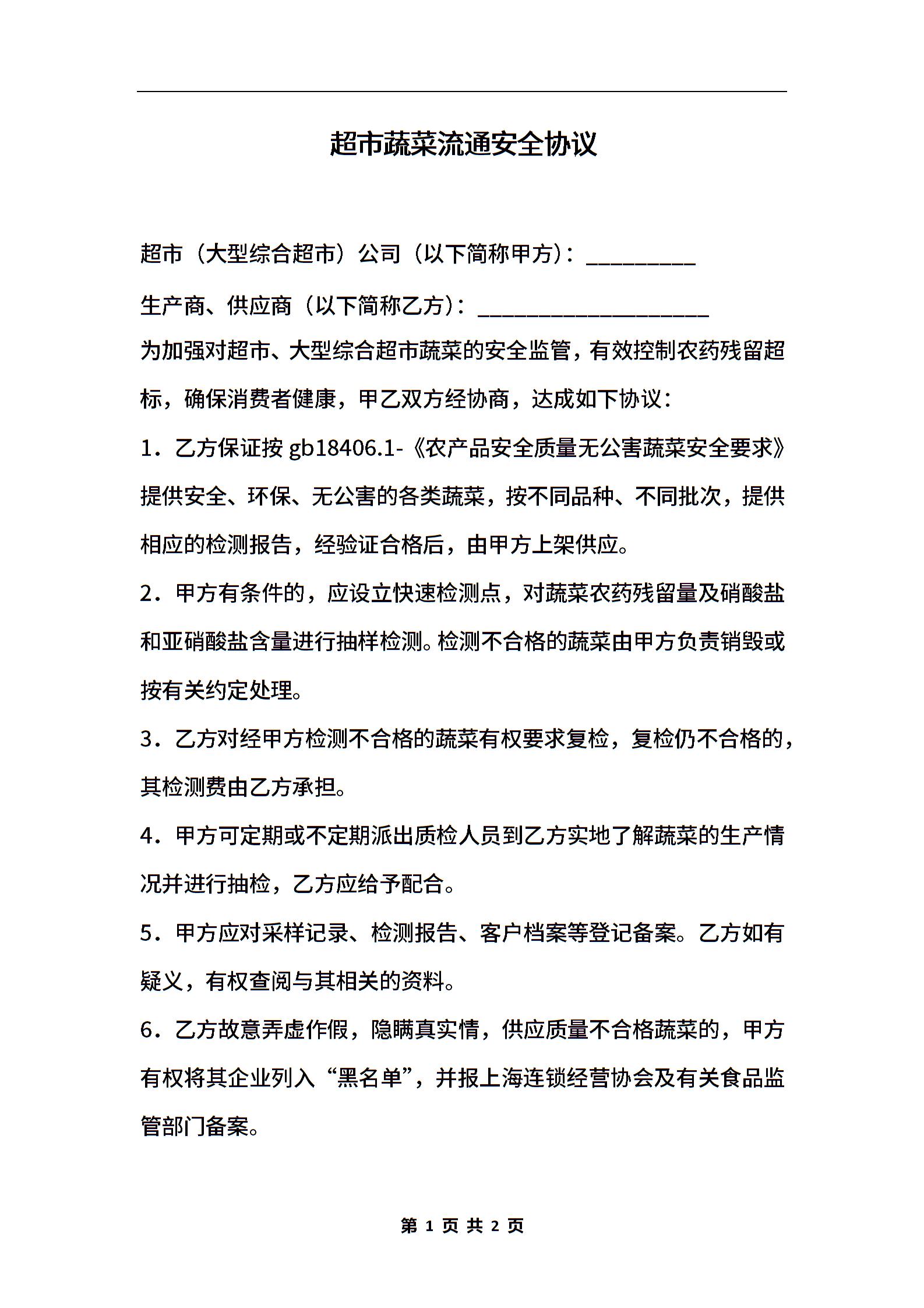 超市蔬菜流通安全协议