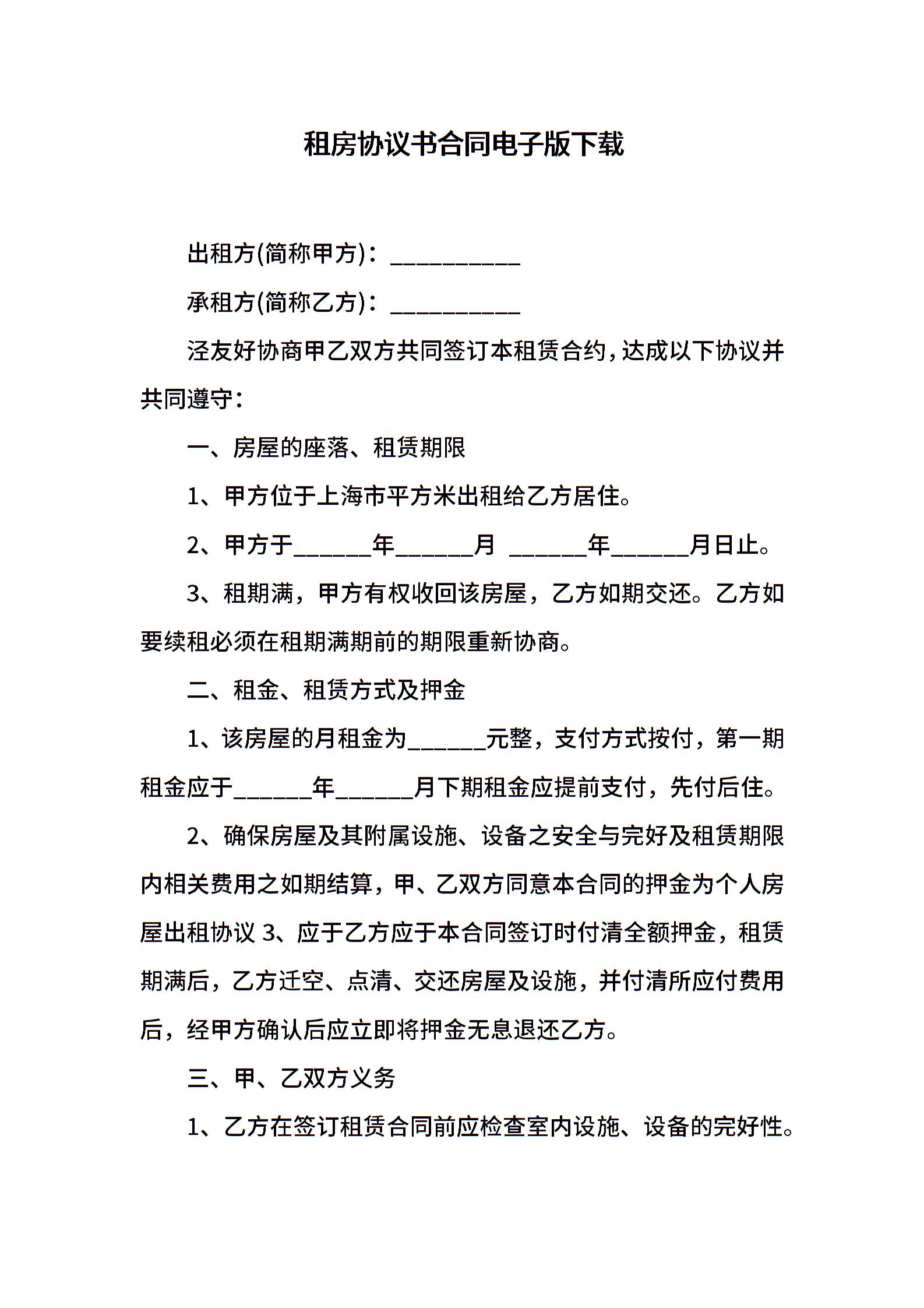 租房协议书合同电子版下载