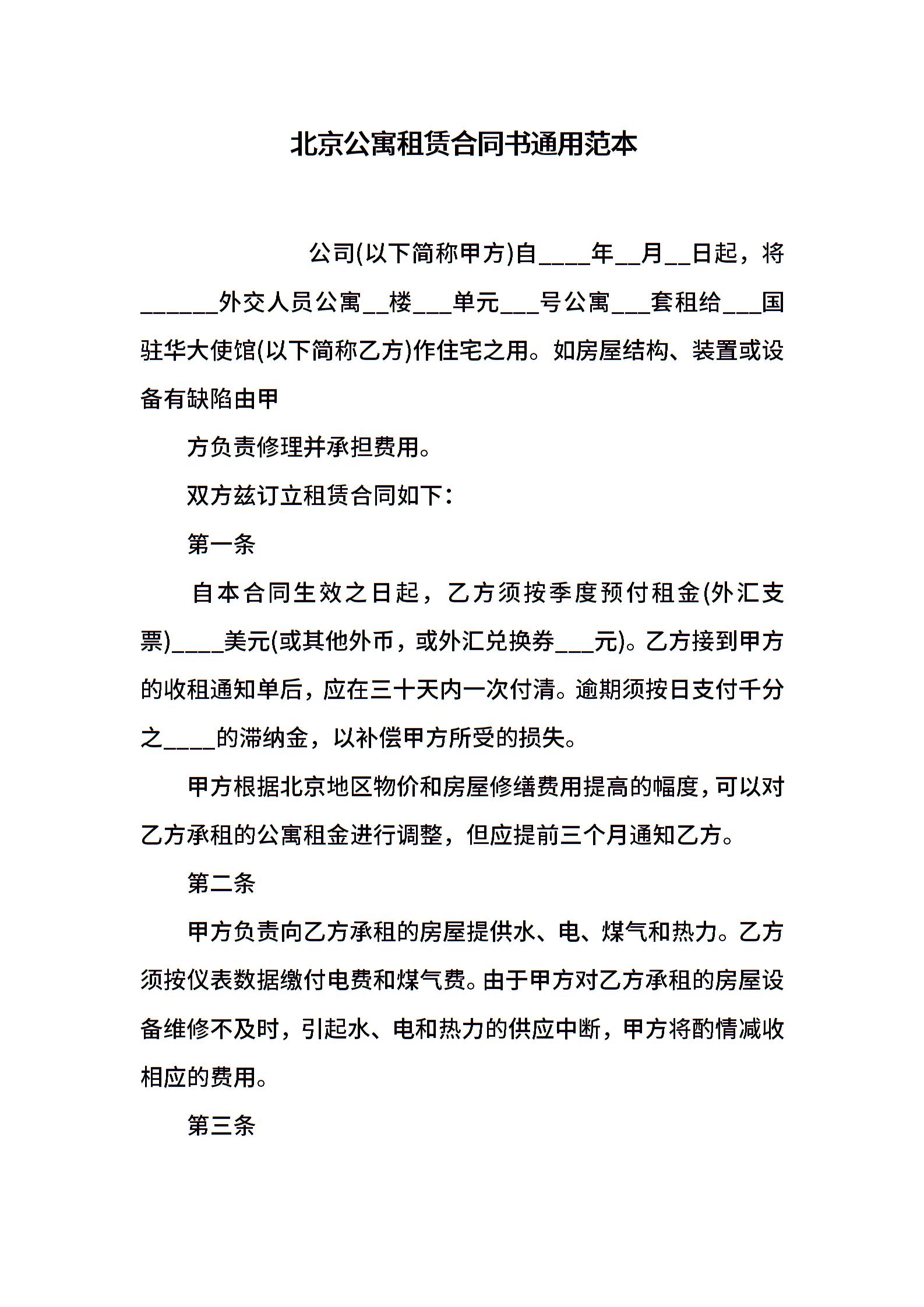 北京公寓租赁合同书通用范本