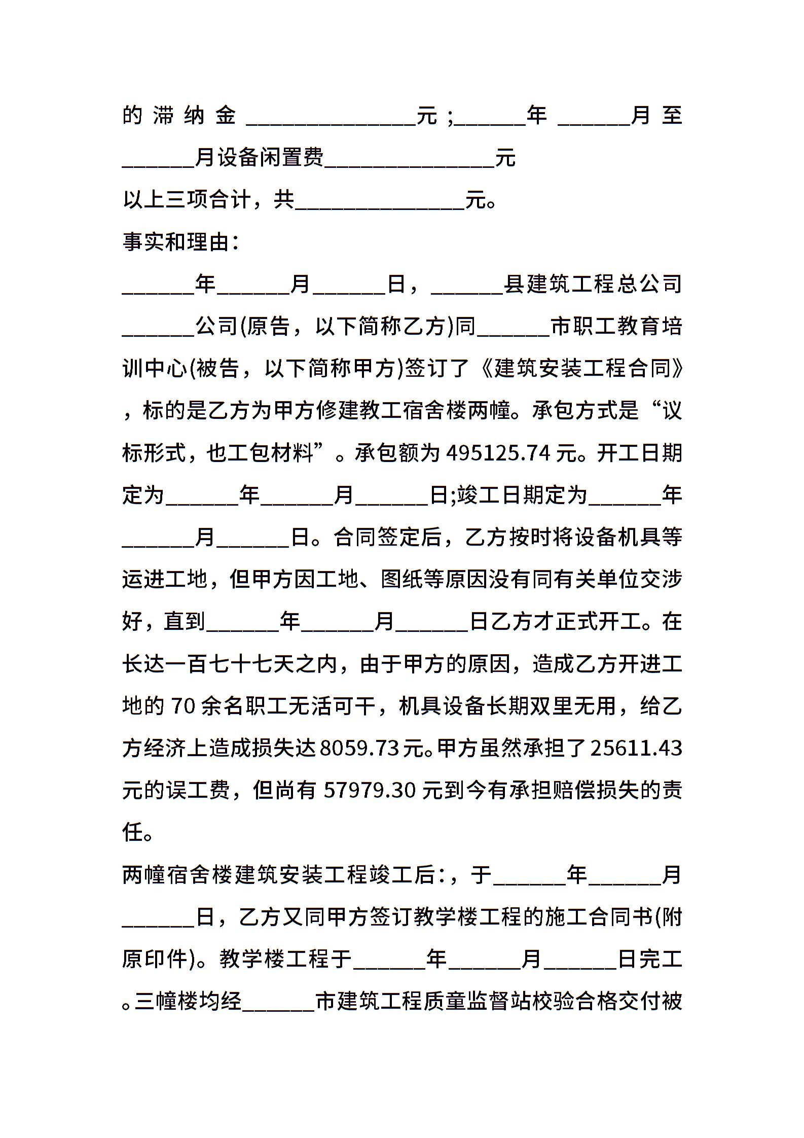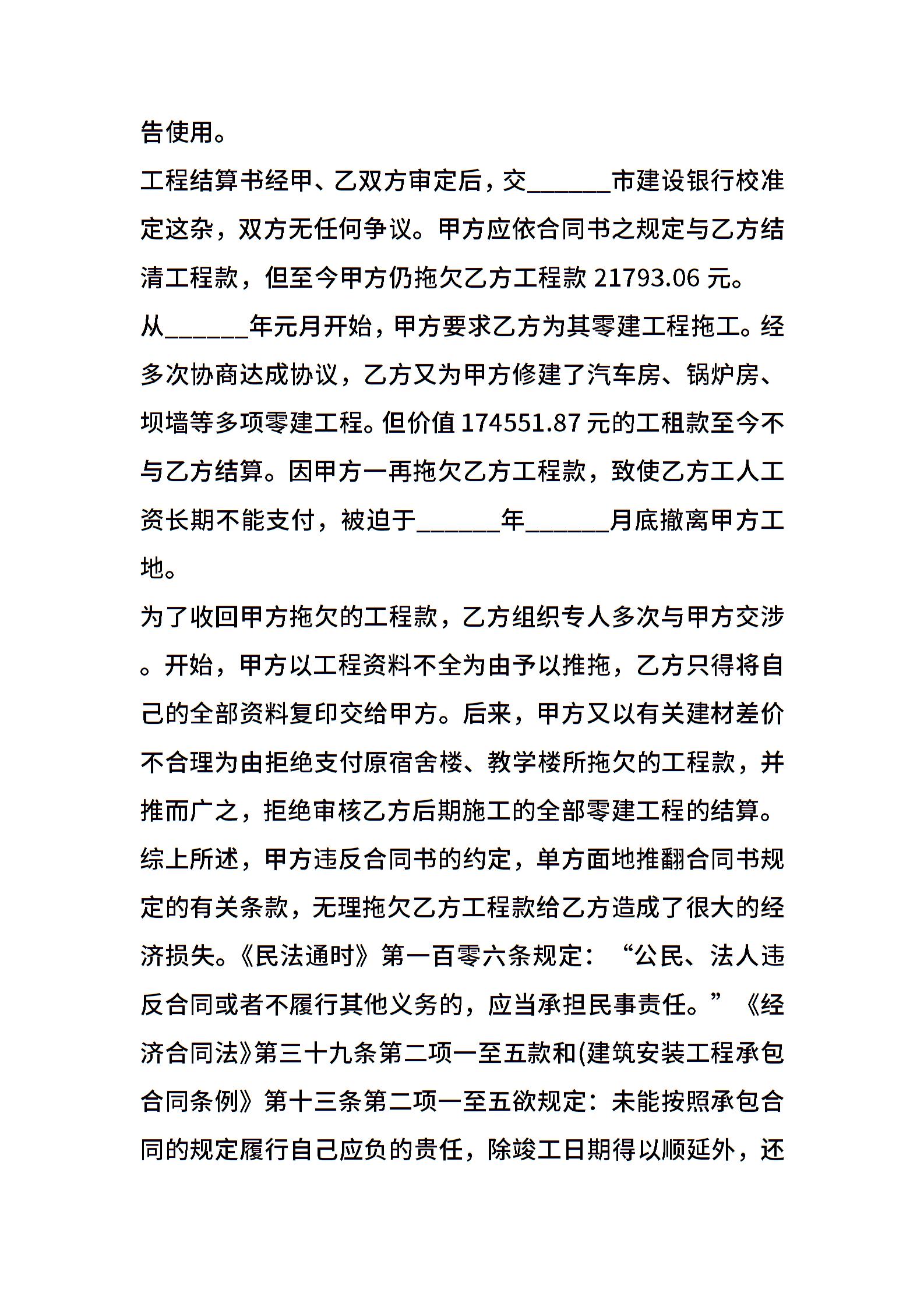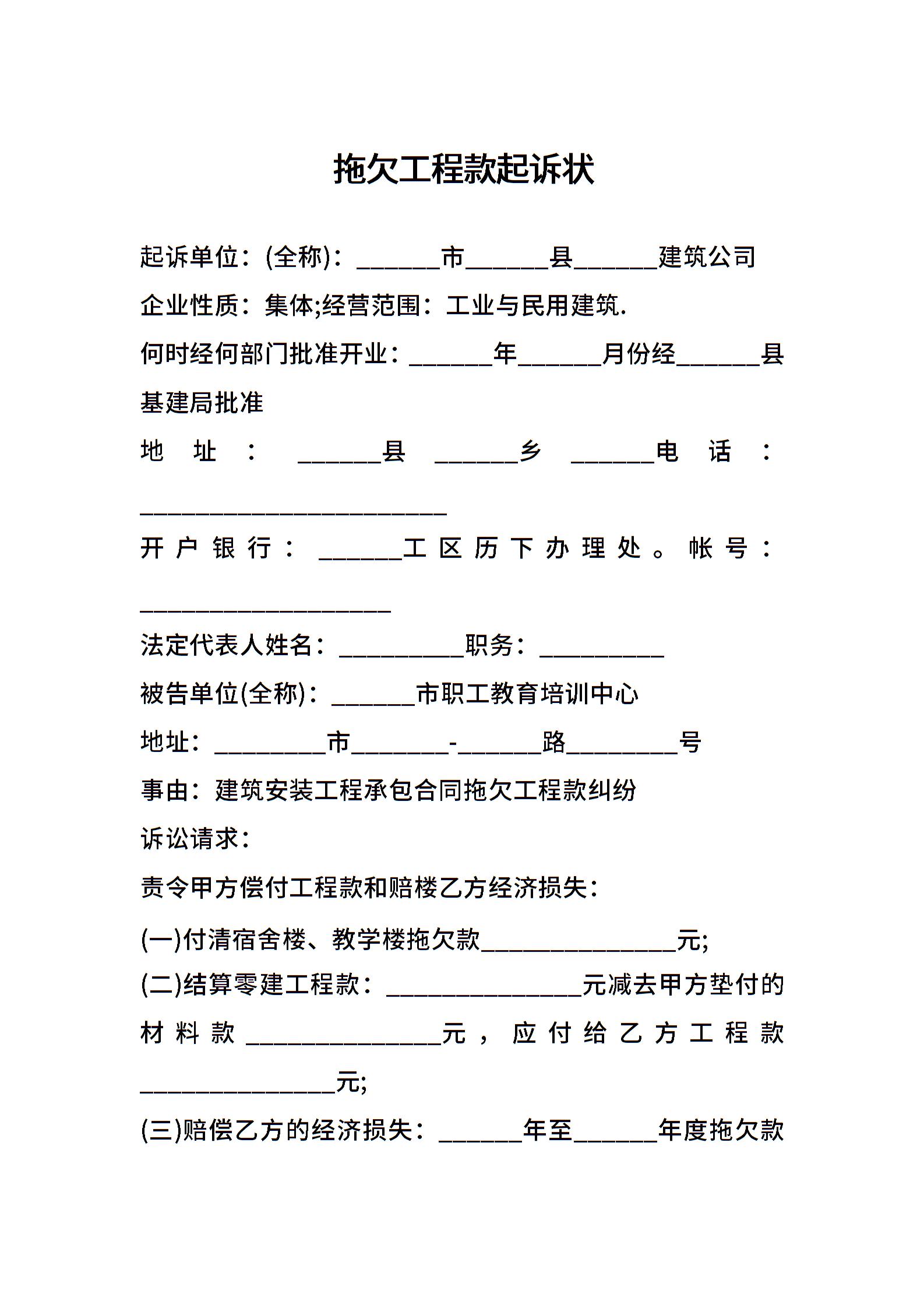 拖欠工程款起诉状