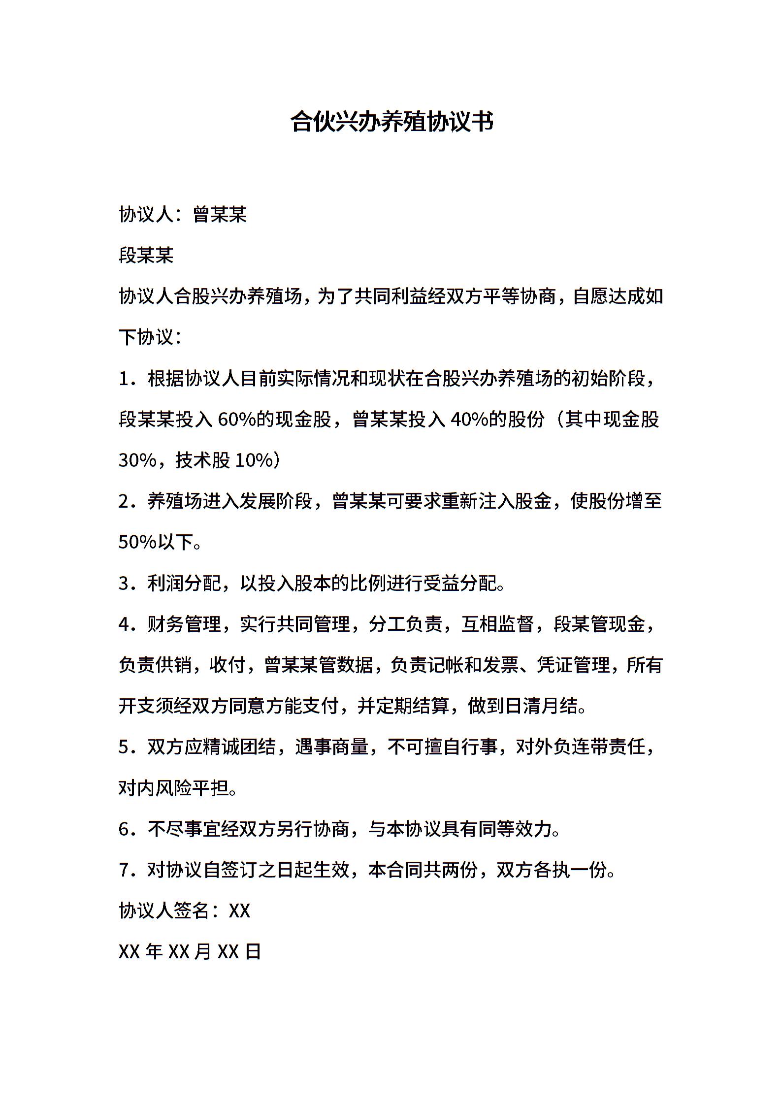 合伙兴办养殖协议书