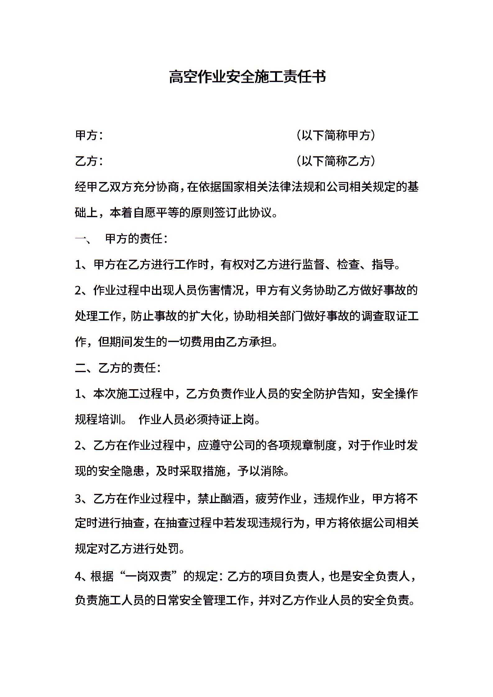 高空作业安全施工责任书