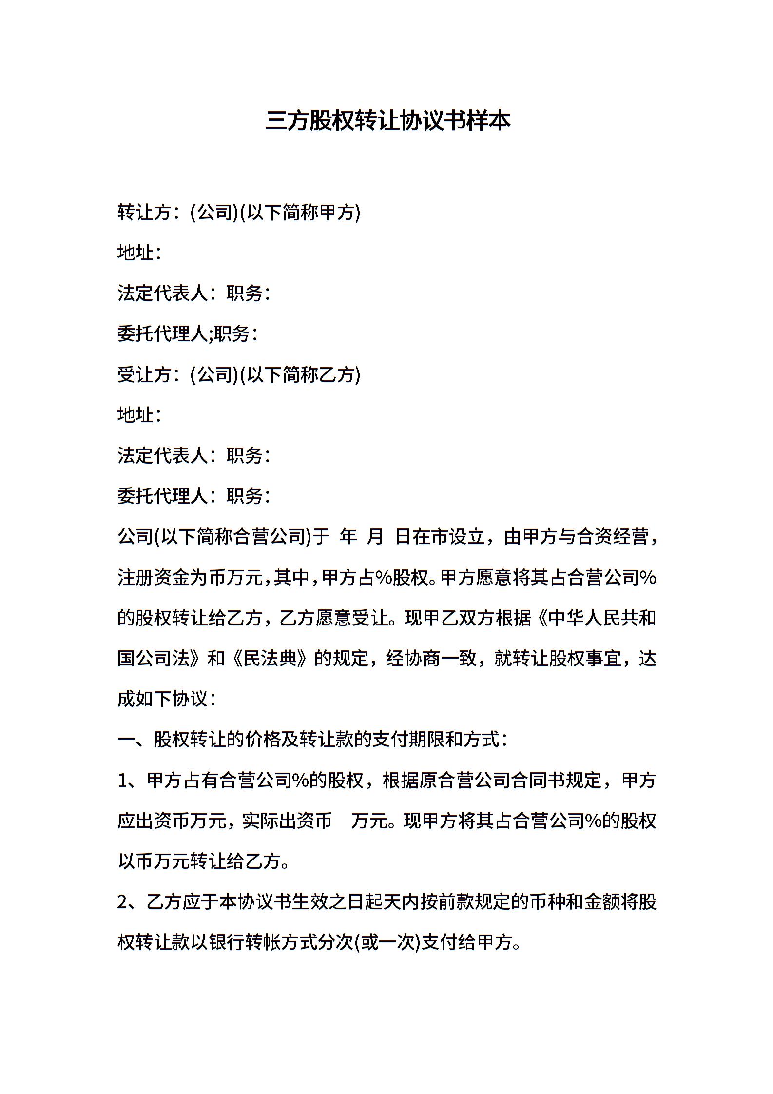 三方股权转让协议书样本