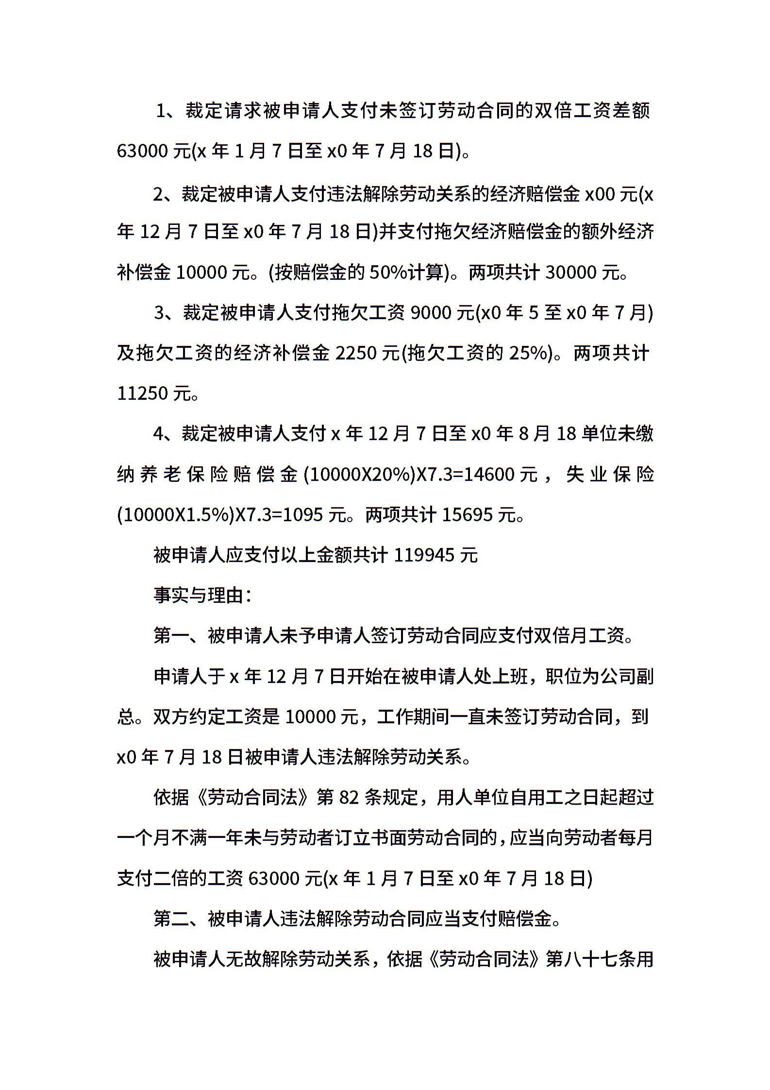 劳动仲裁申请书双倍工资
