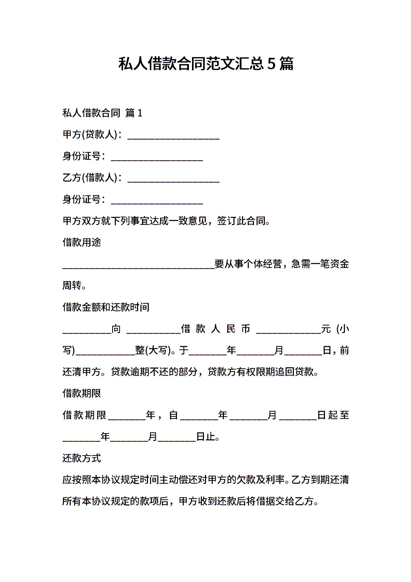 私人借款合同范文汇总5篇