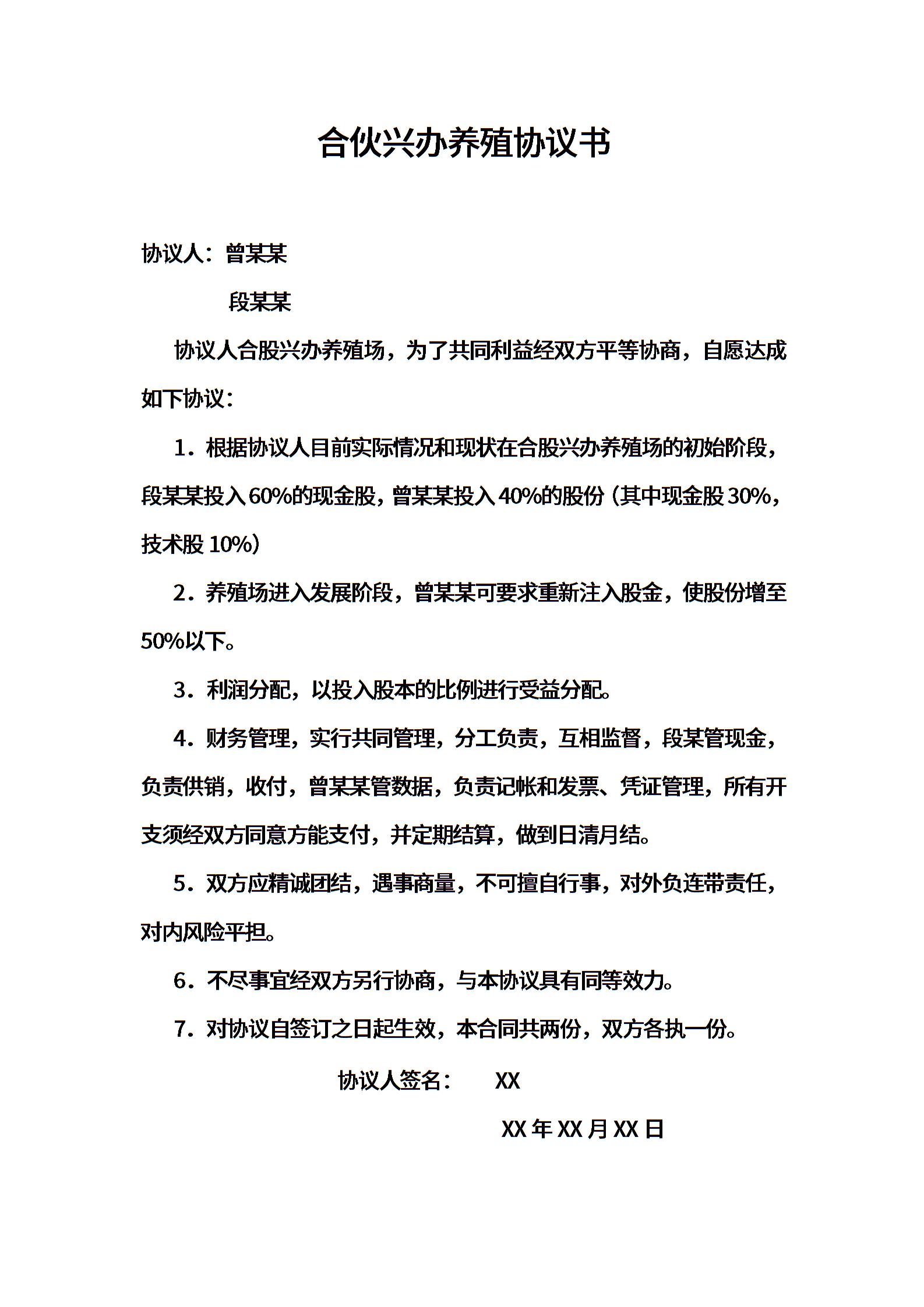 合伙兴办养殖协议书