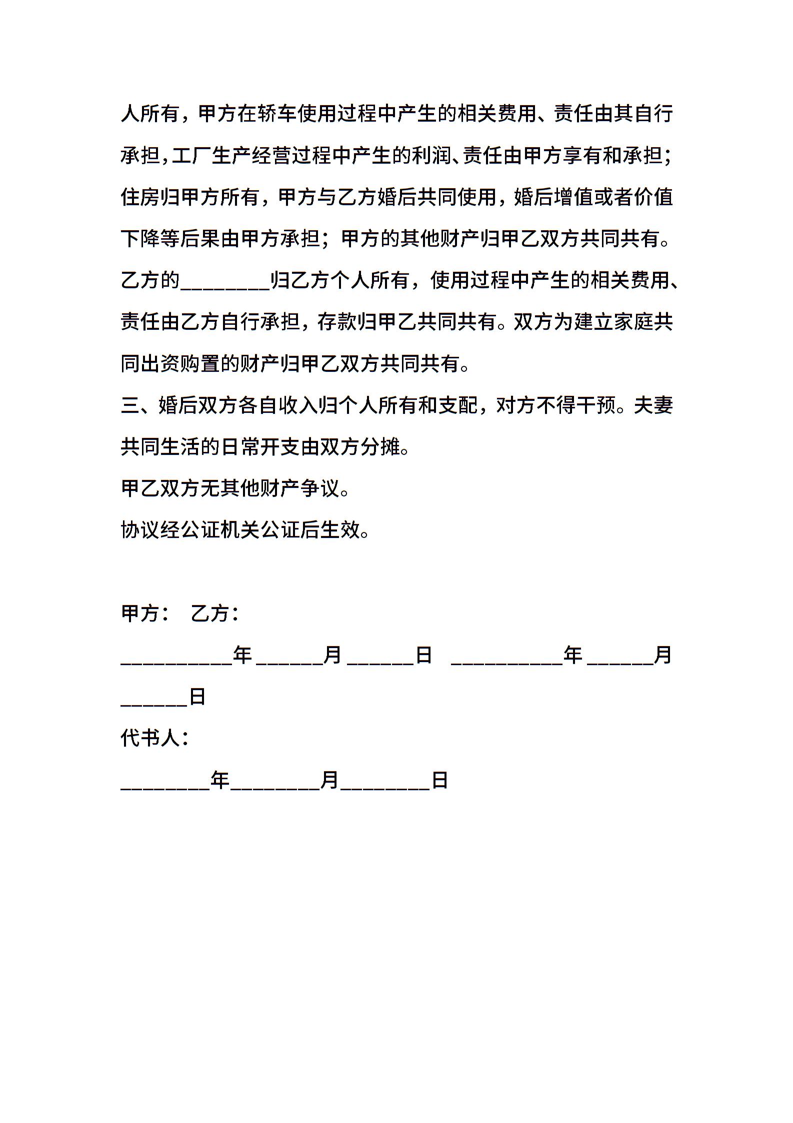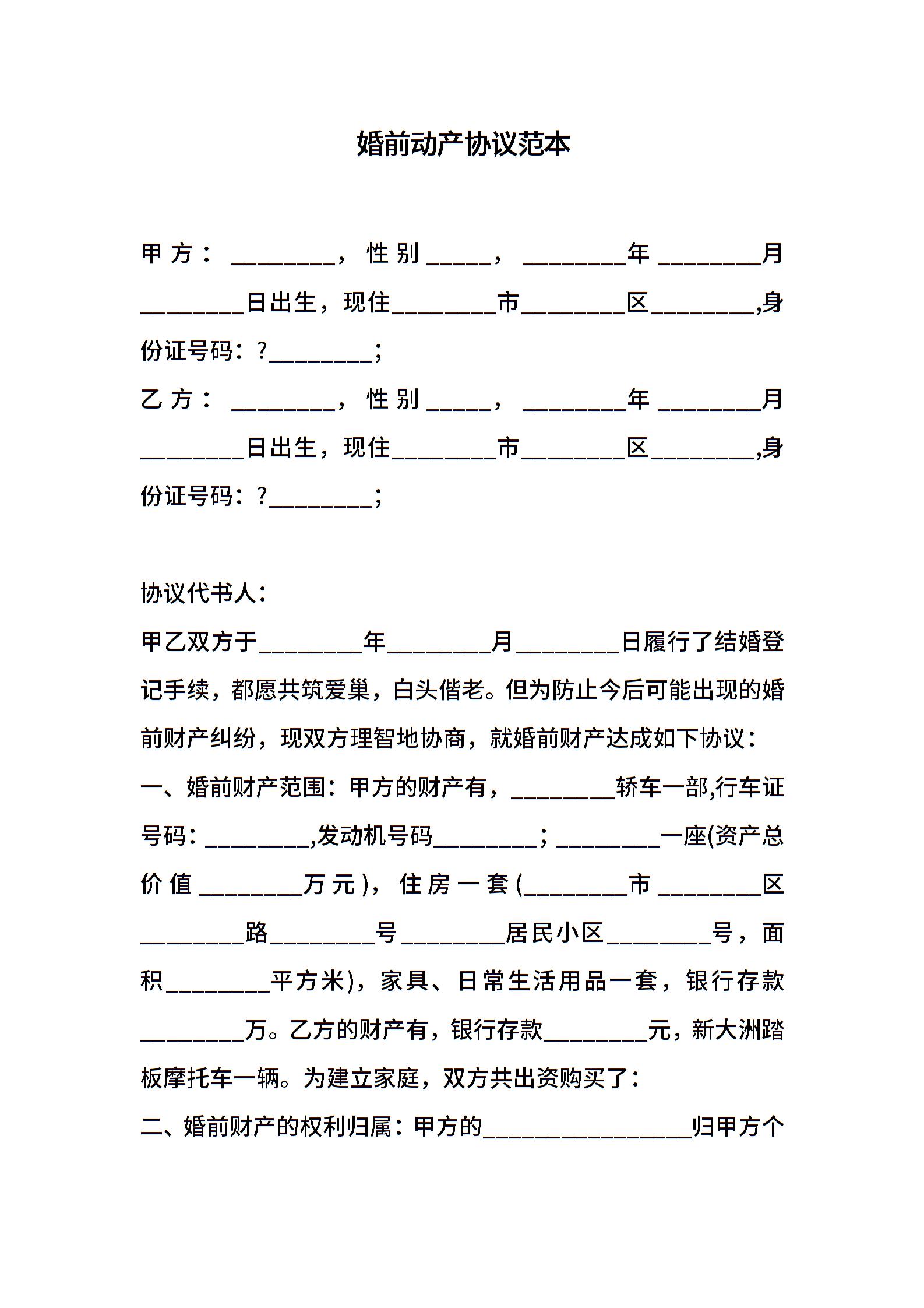 婚前动产协议范本