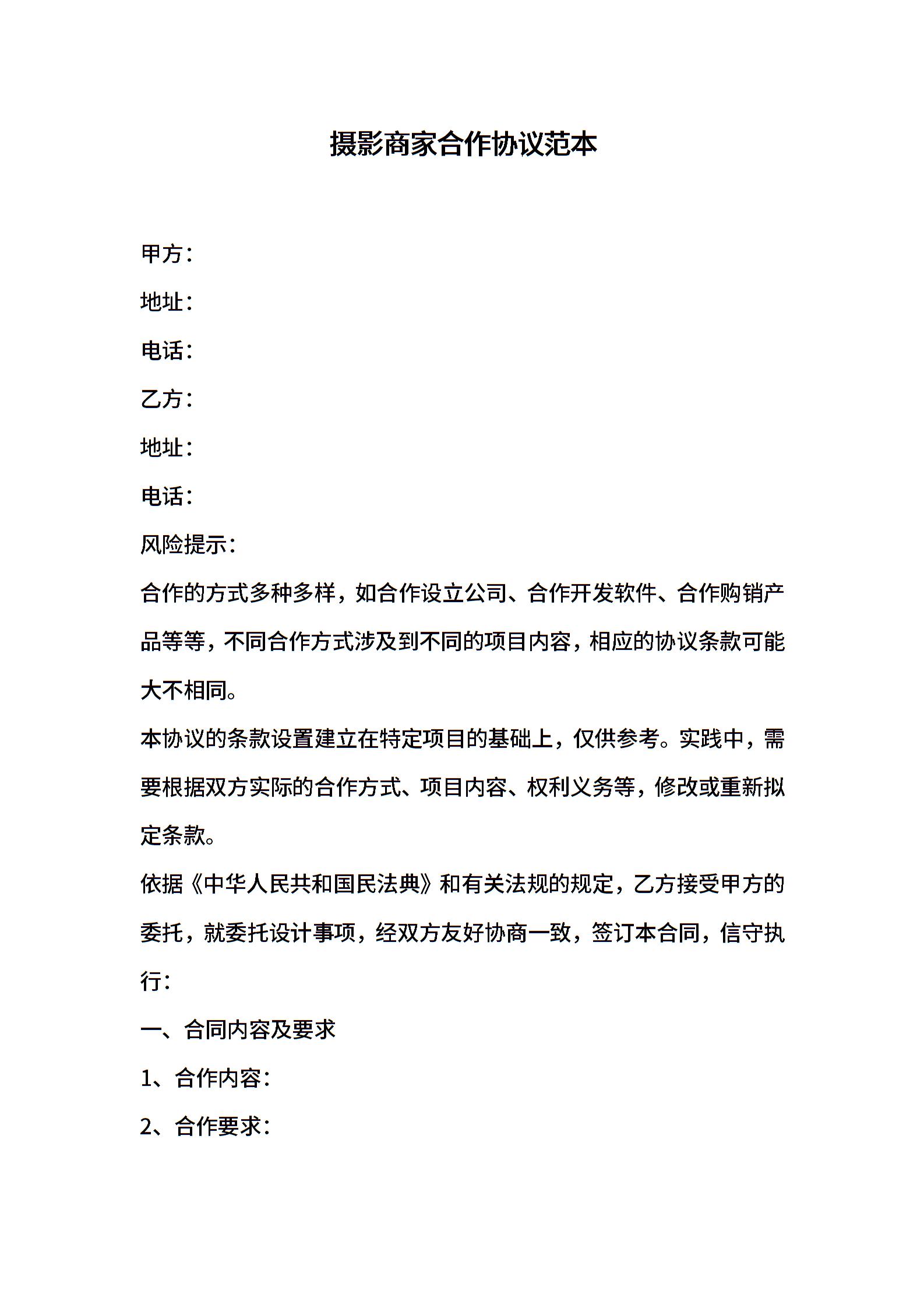 摄影商家合作协议范本