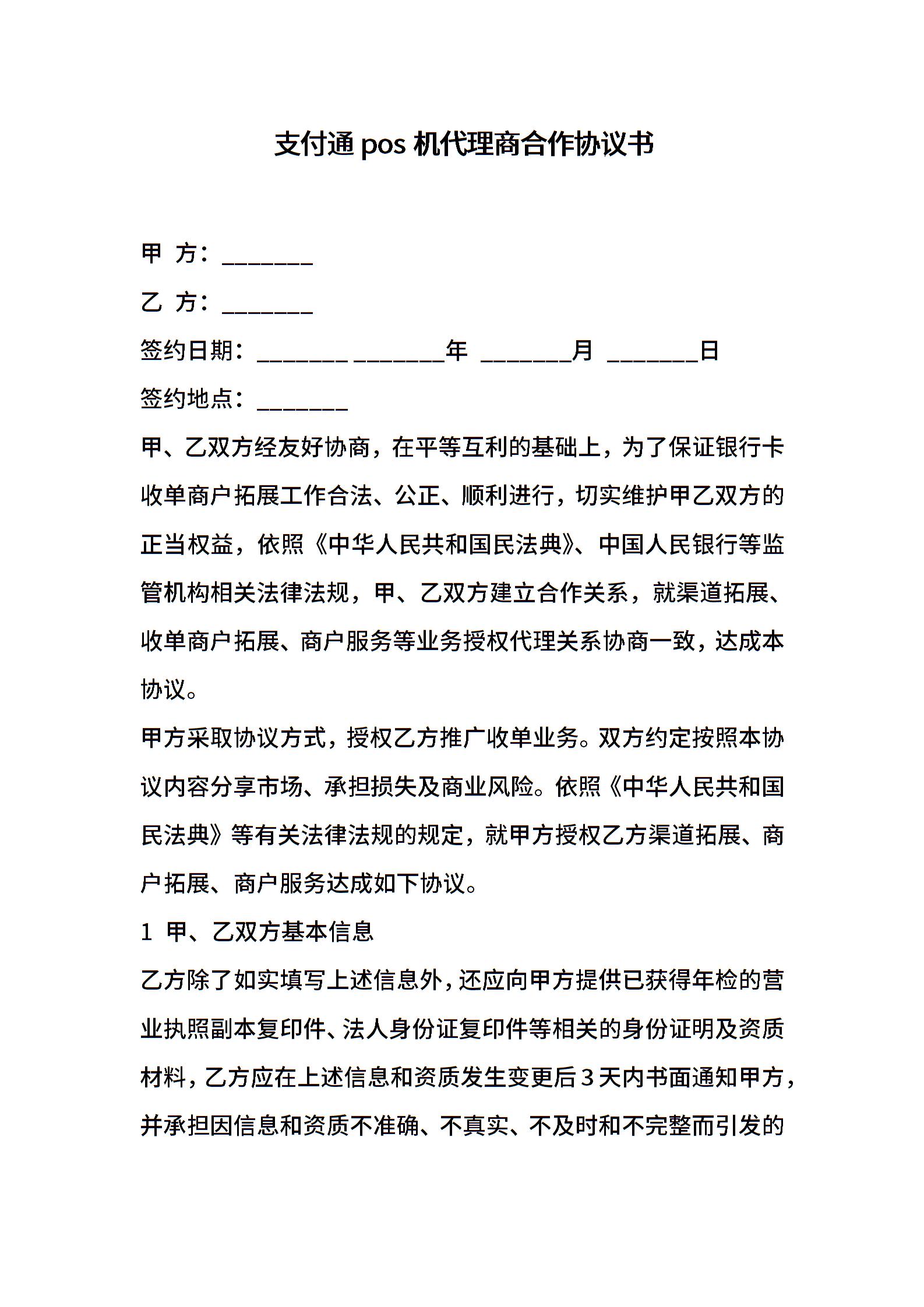 支付通pos机代理商合作协议书