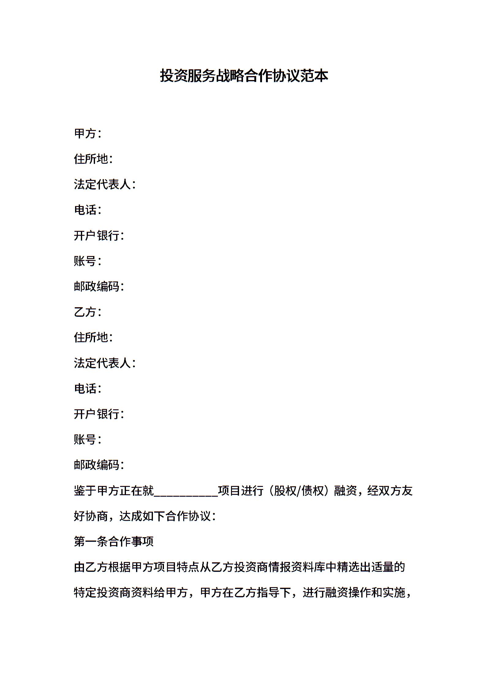 投资服务战略合作协议范本