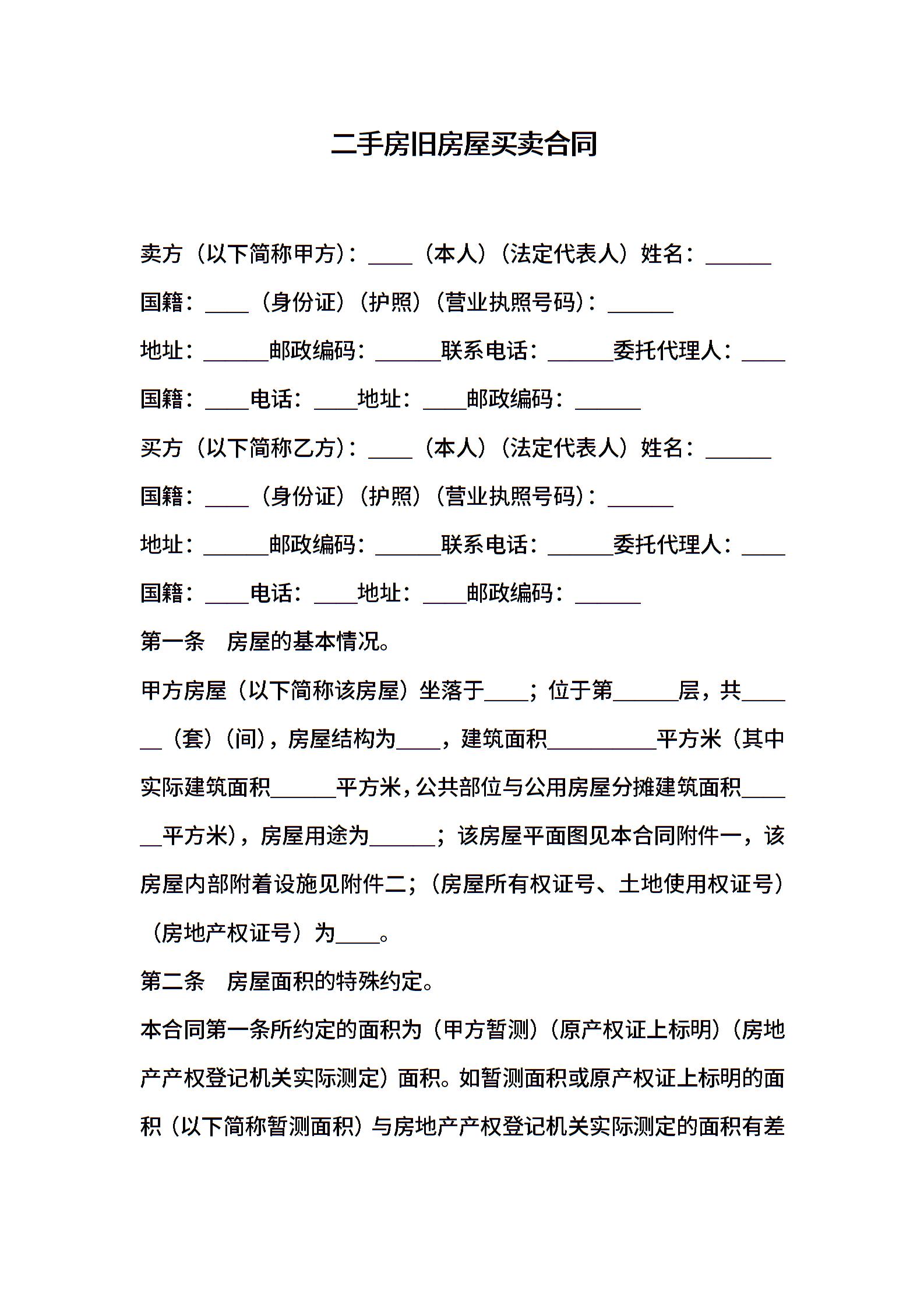二手房旧房屋买卖合同