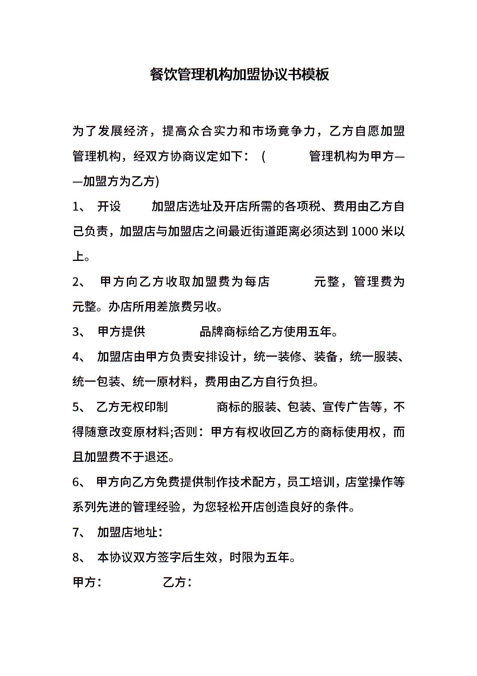 餐饮管理机构加盟协议书模板