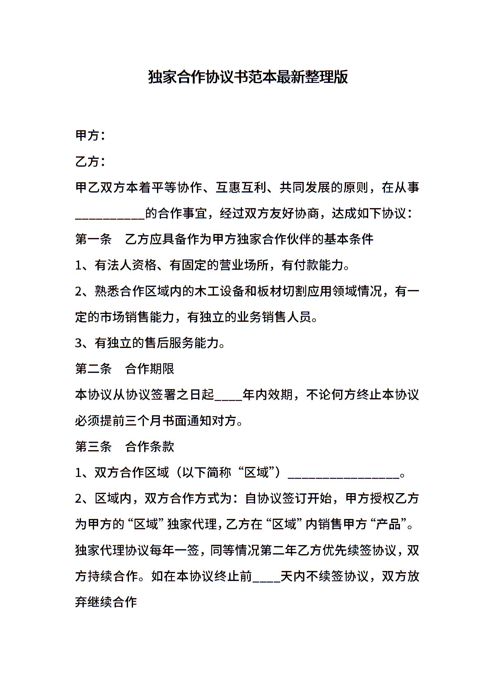独家合作协议书范本最新整理版