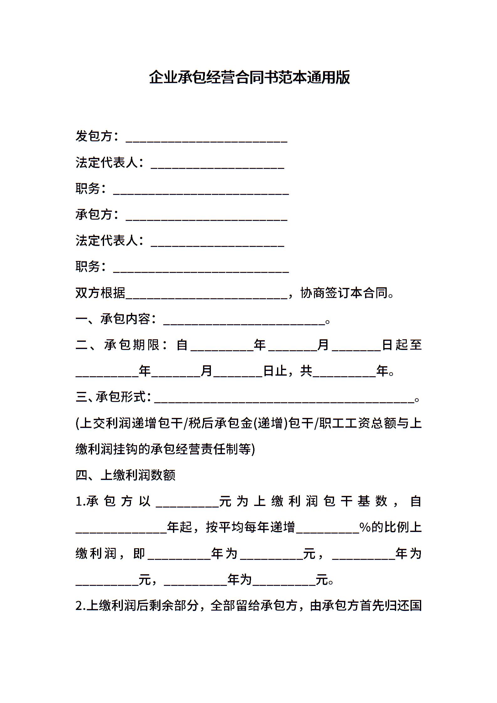 企业承包经营合同书范本通用版