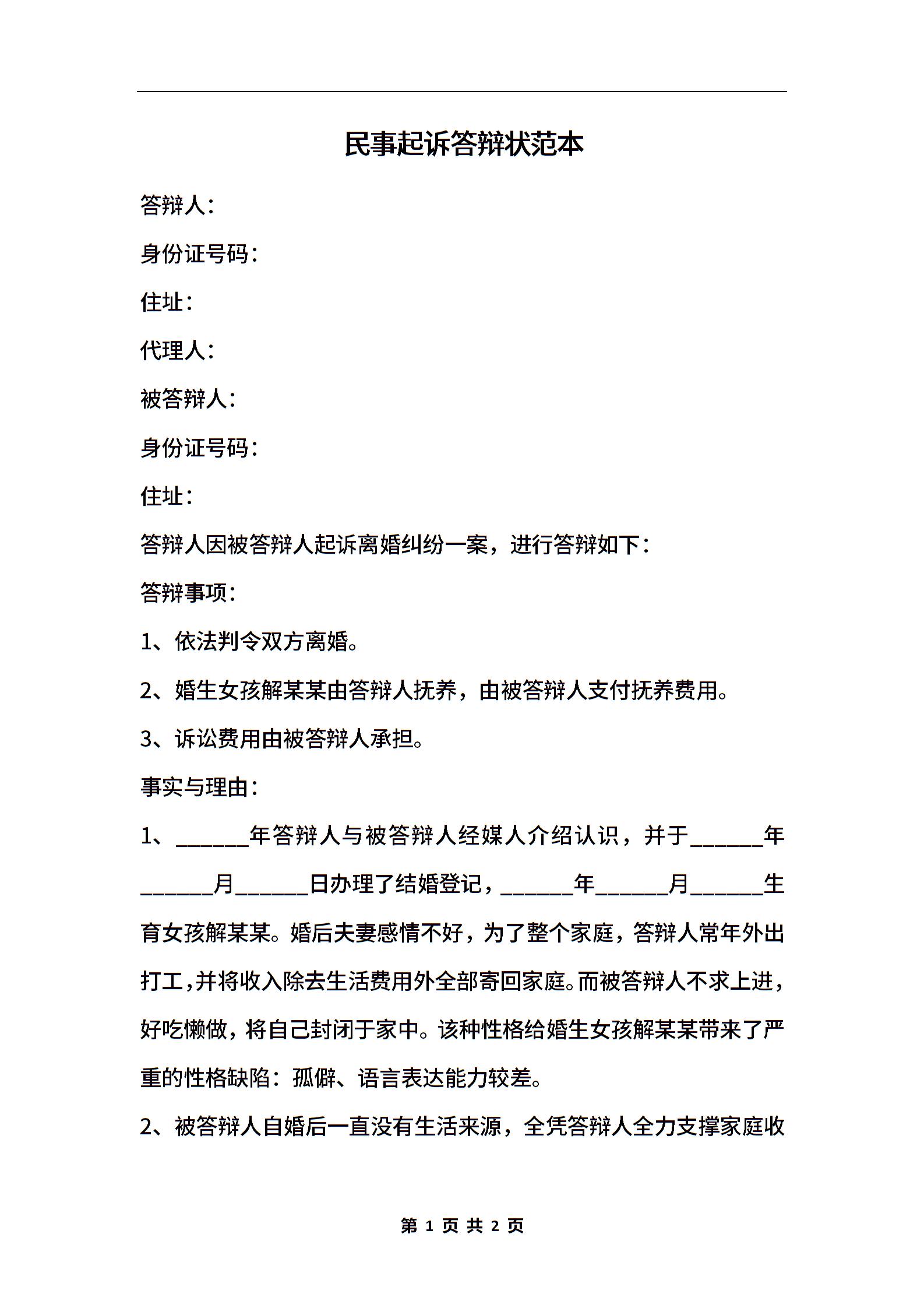 民事起诉答辩状范本