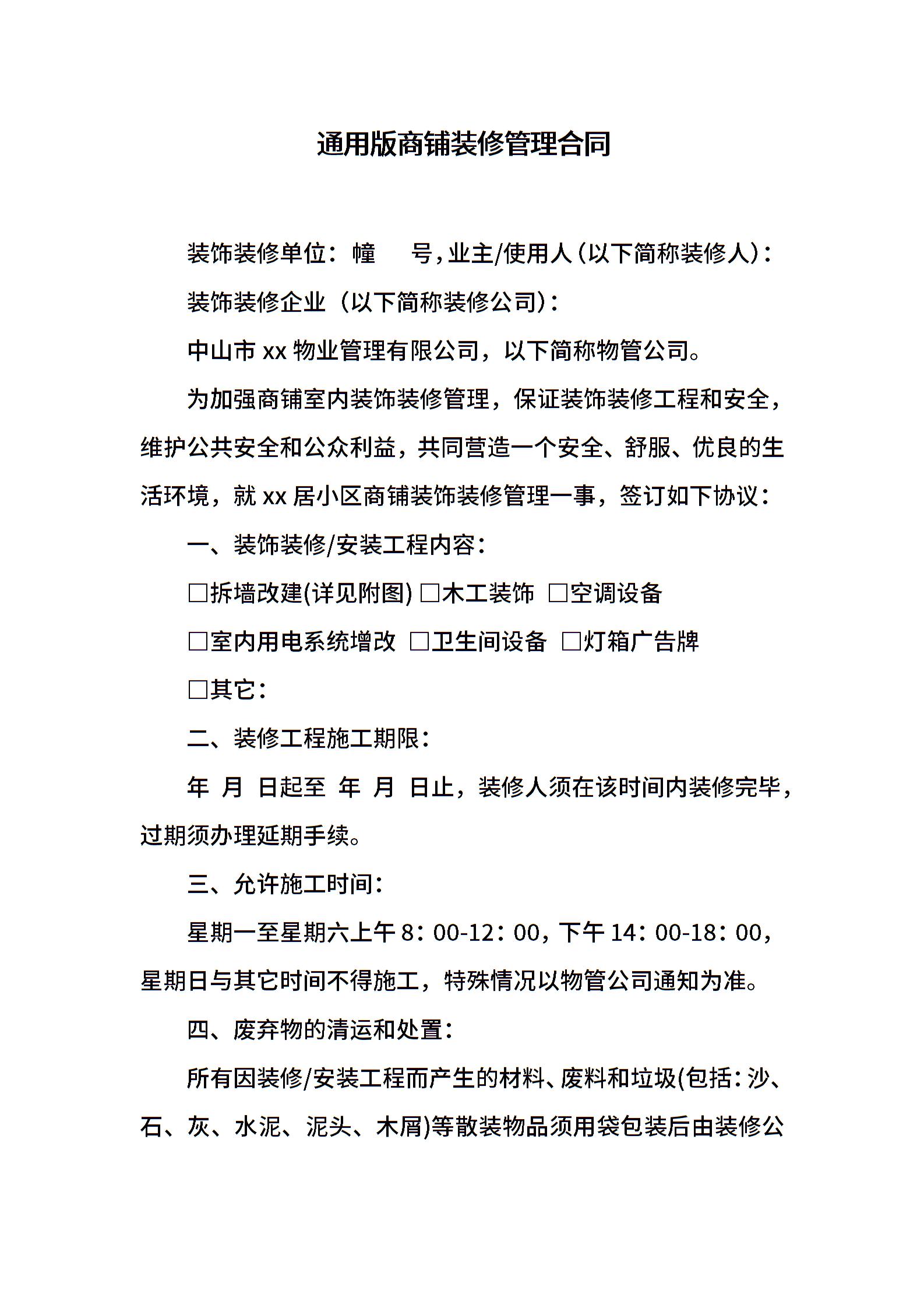 通用版商铺装修管理合同
