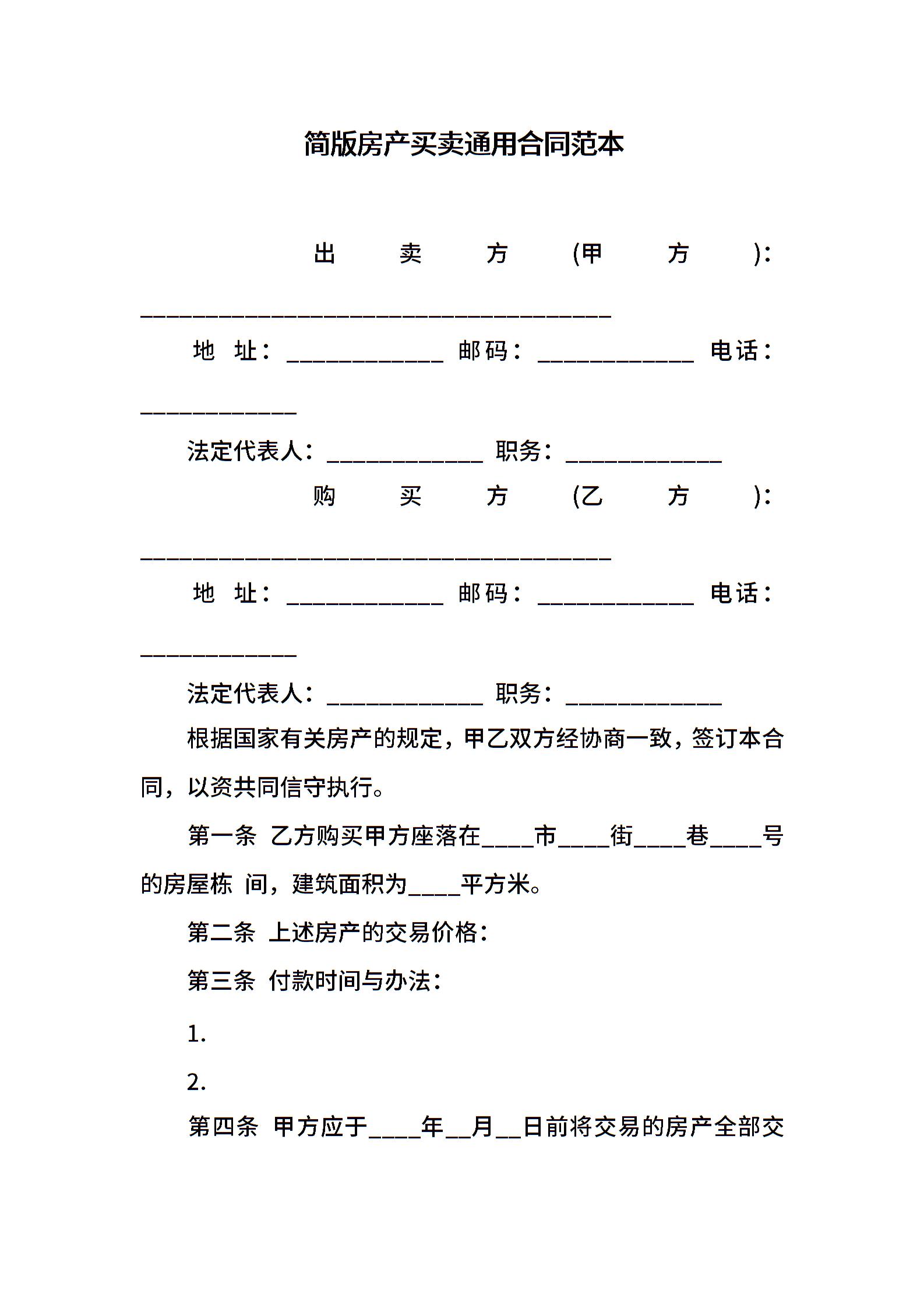 简版房产买卖通用合同范本