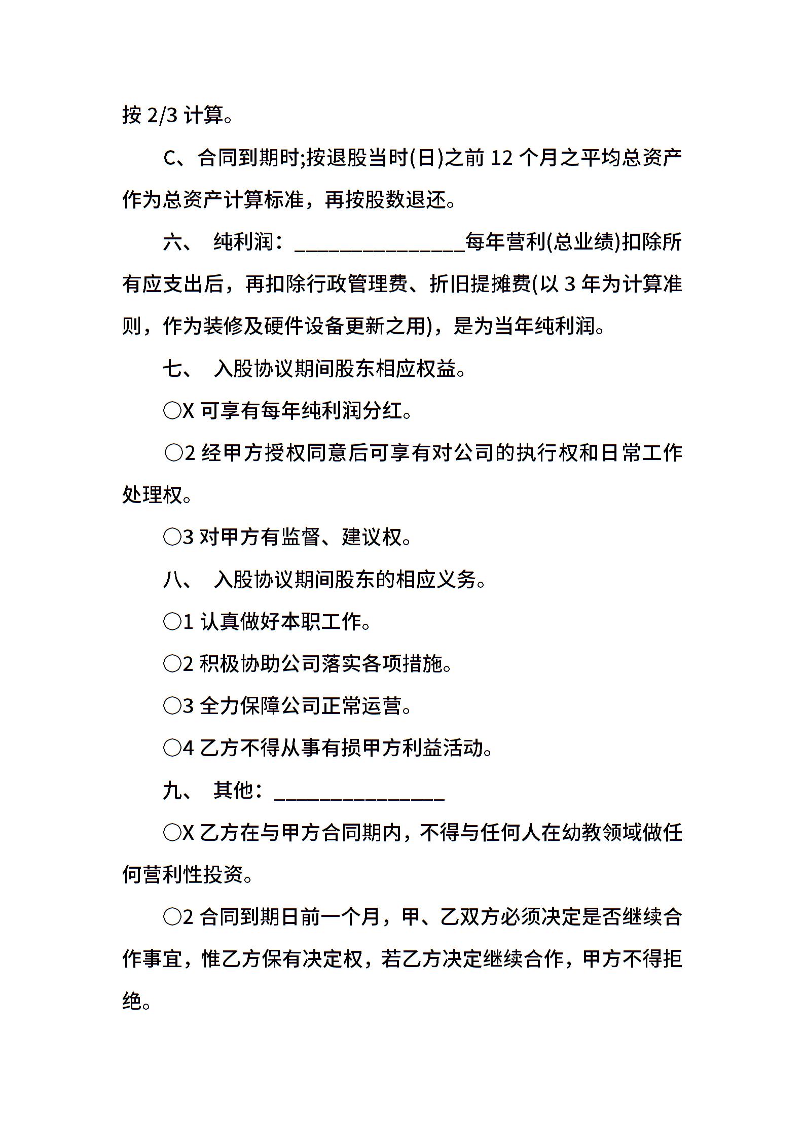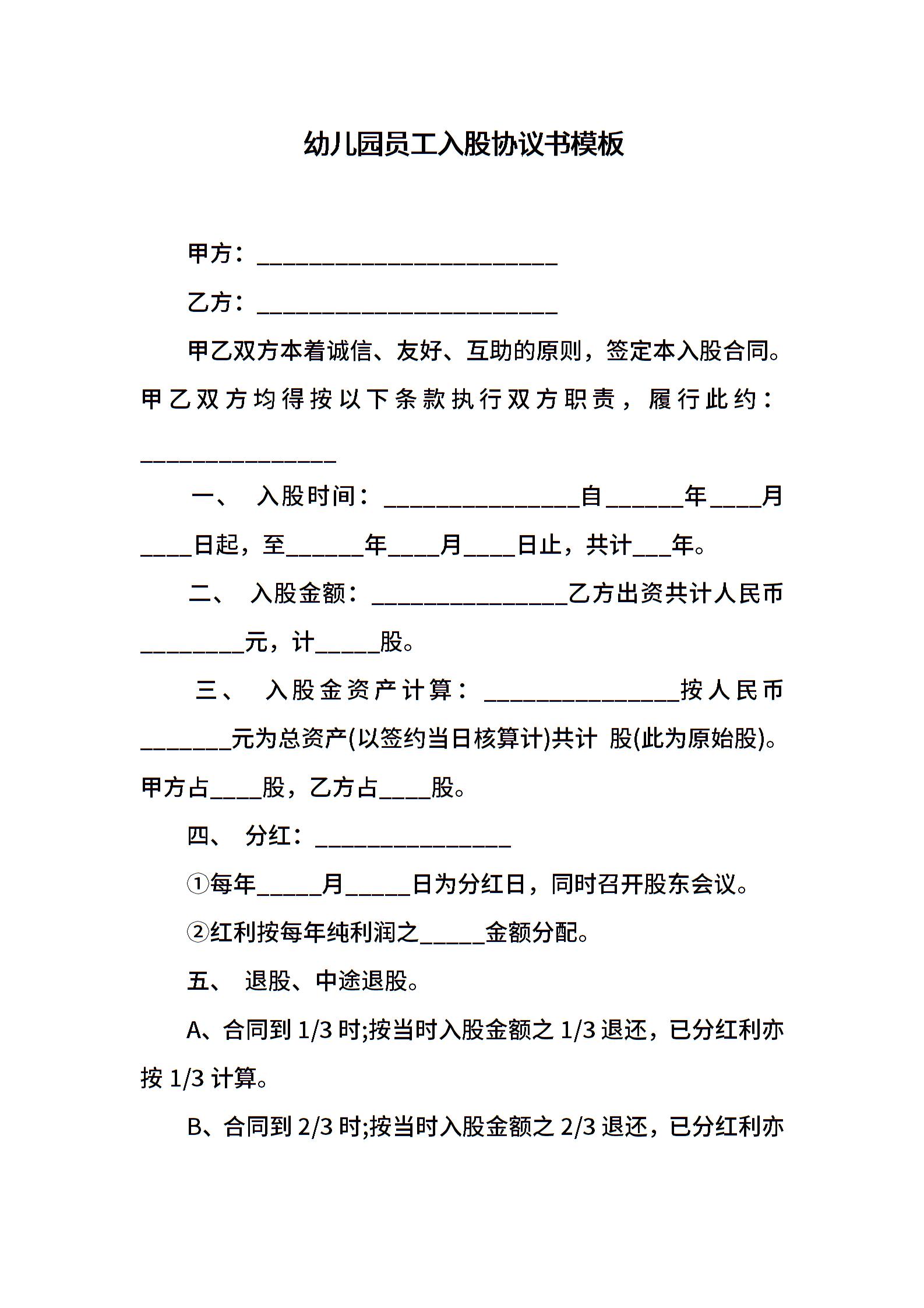 幼儿园员工入股协议书模板