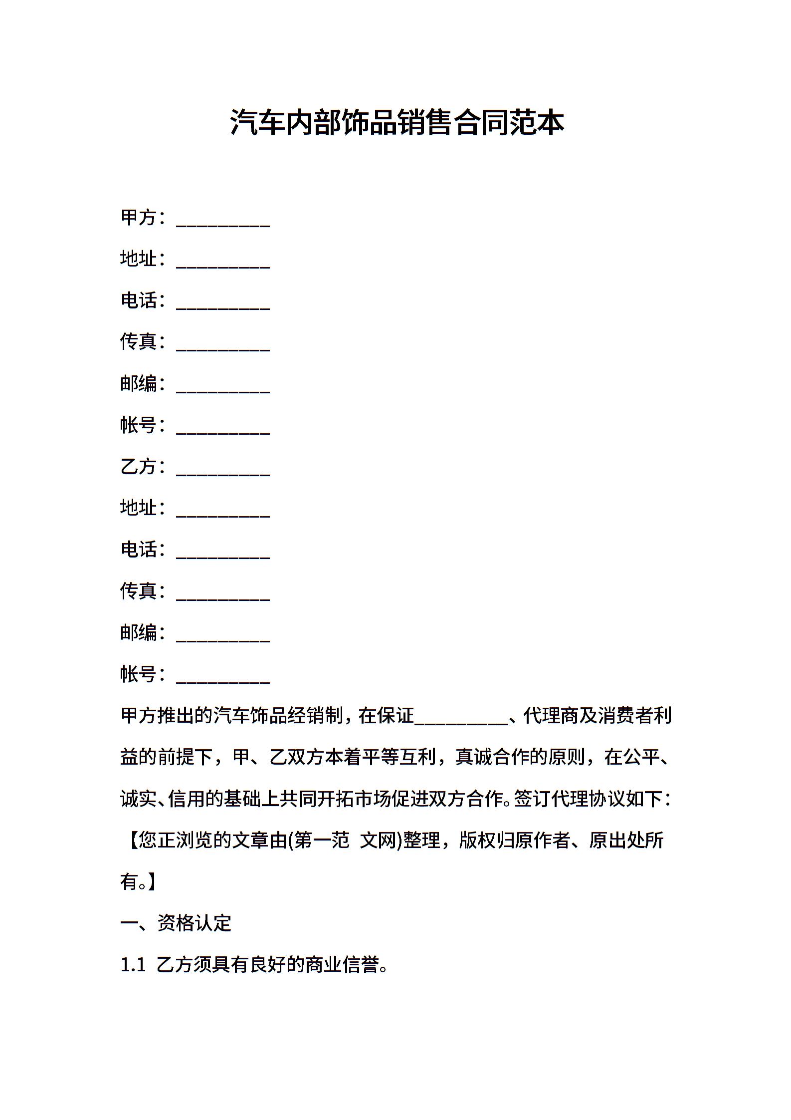 汽车内部饰品销售合同范本