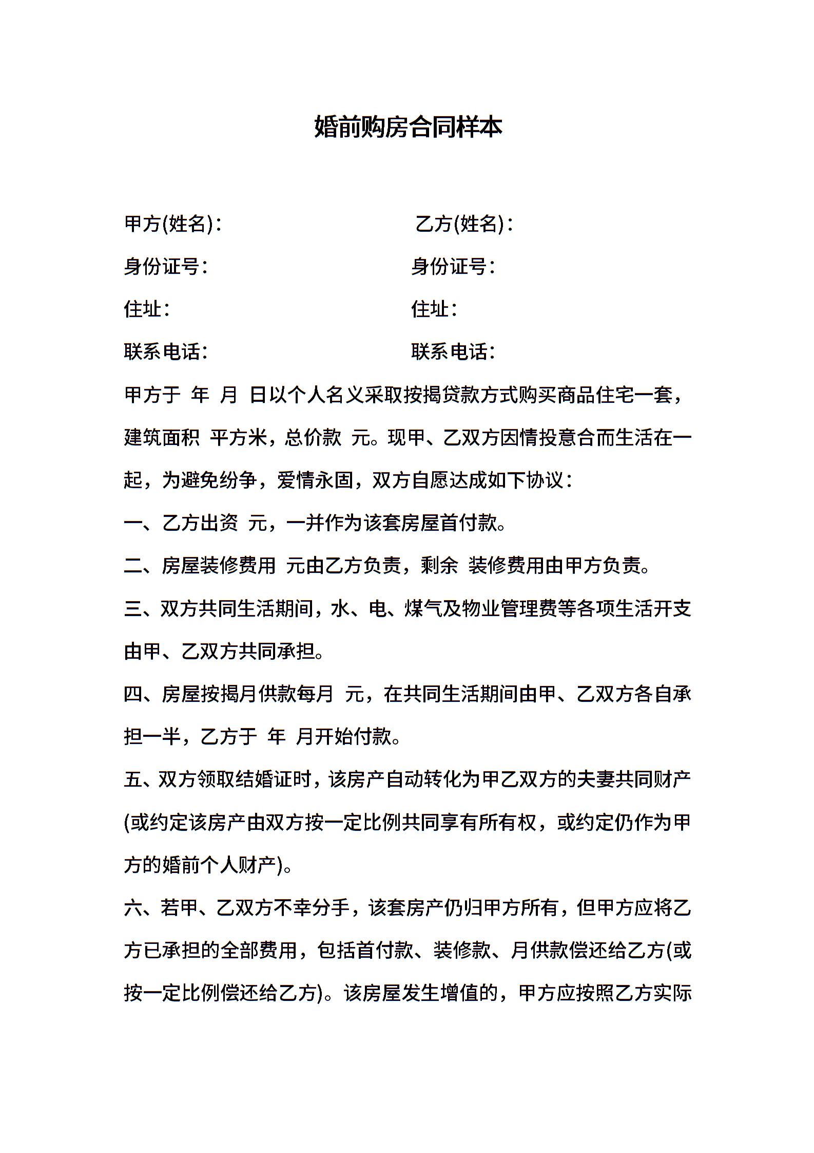 婚前购房合同样本