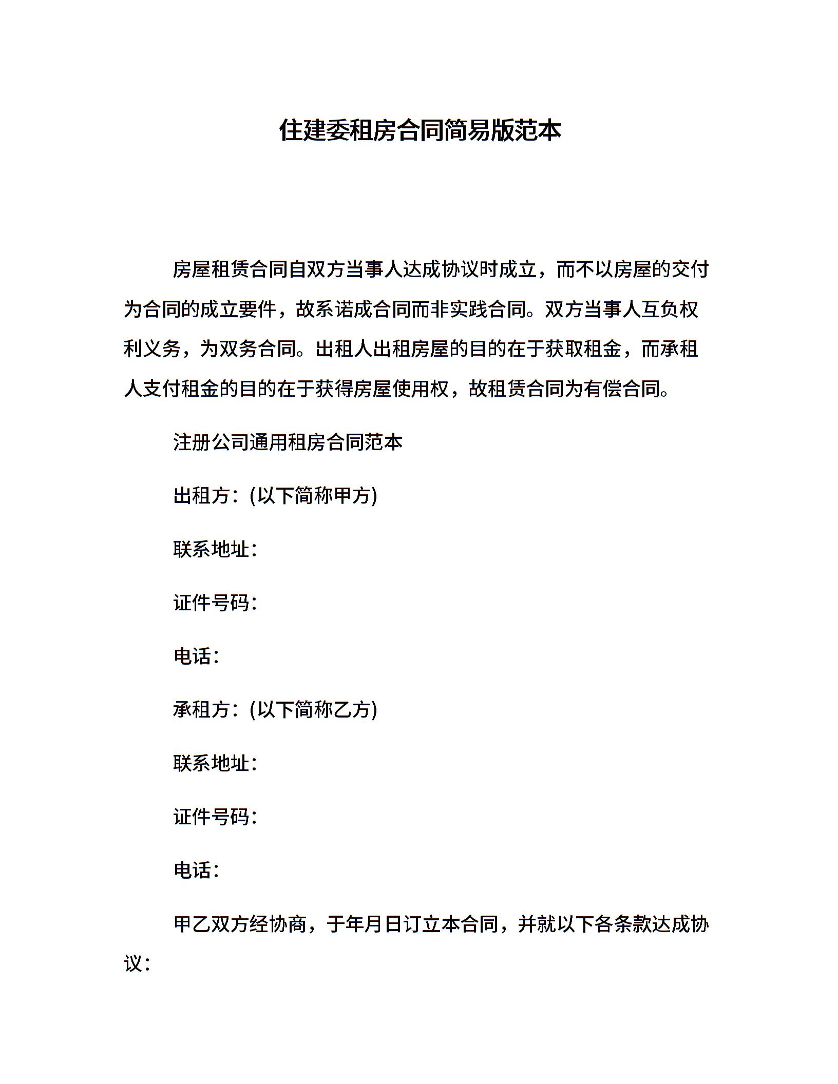 住建委租房合同简易版范本