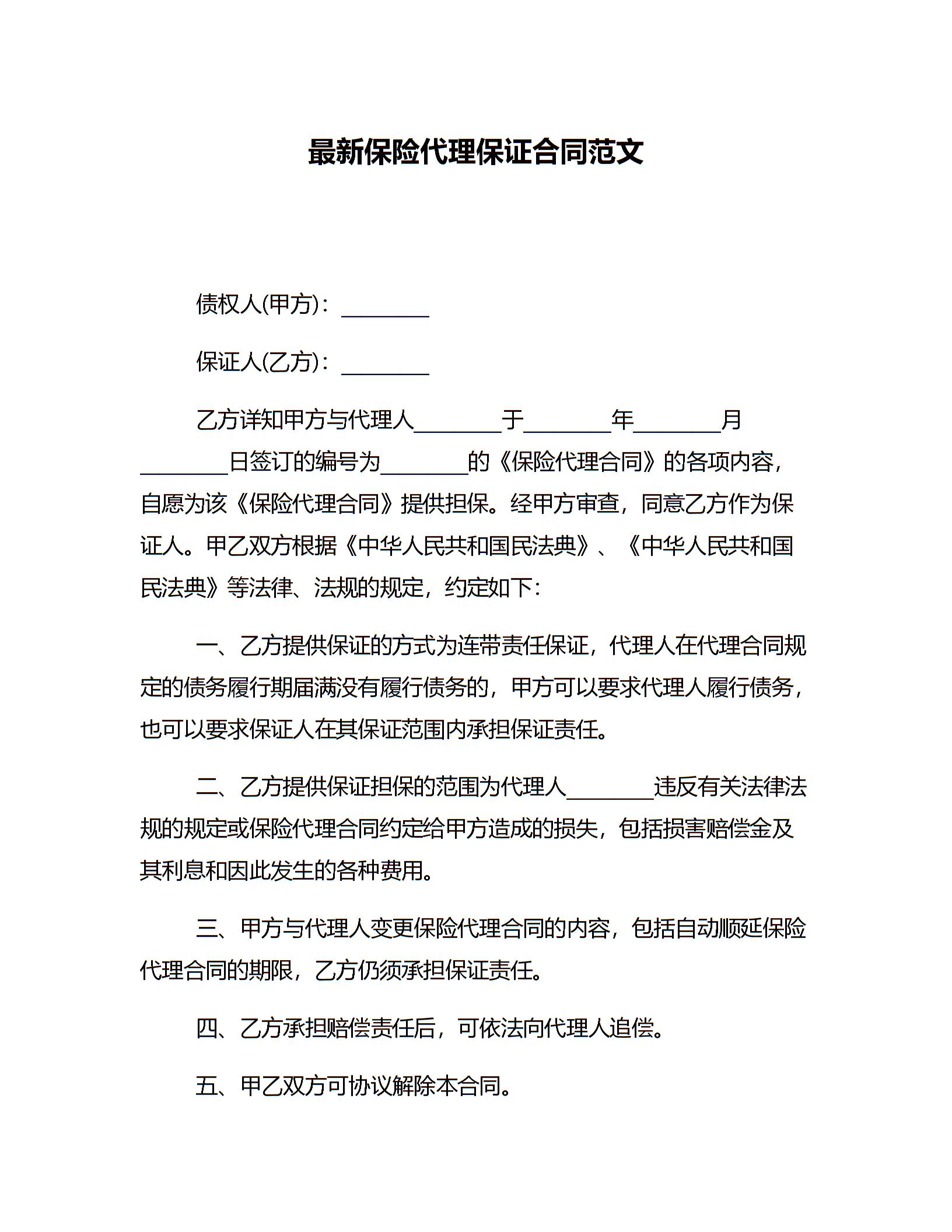 最新保险代理保证合同范文