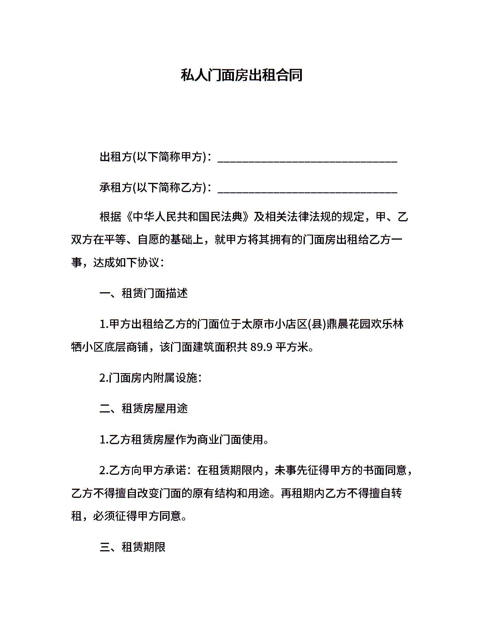 私人门面房出租合同