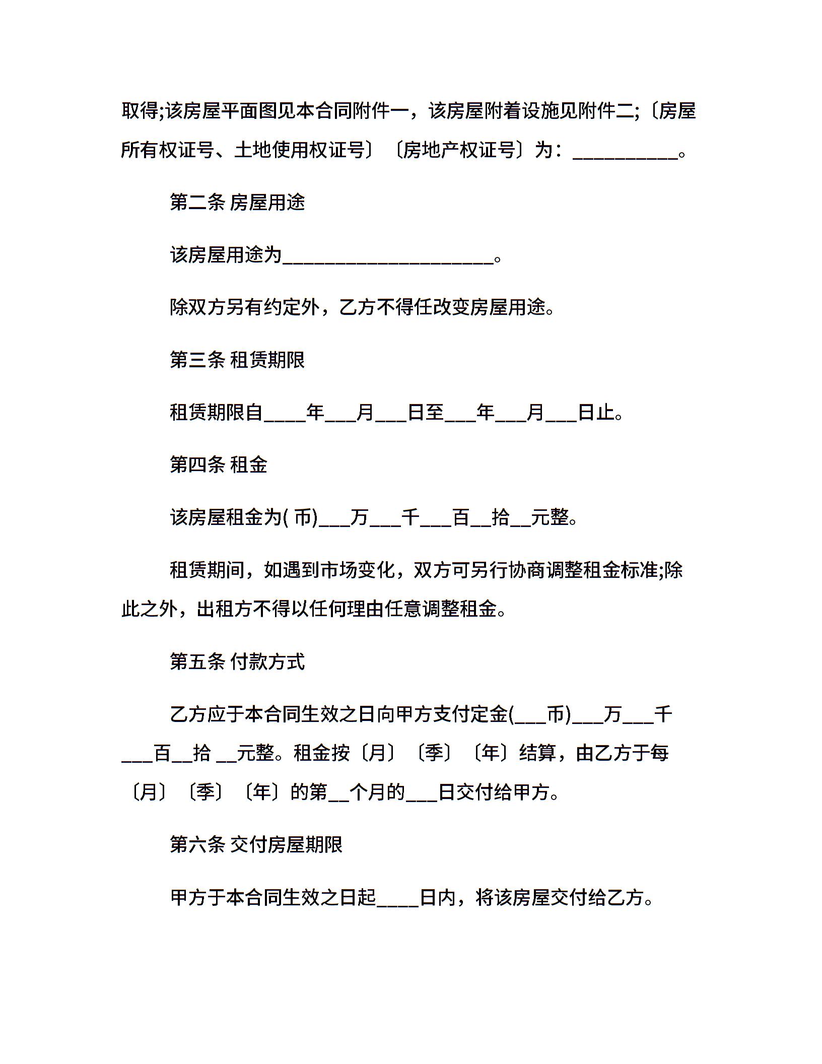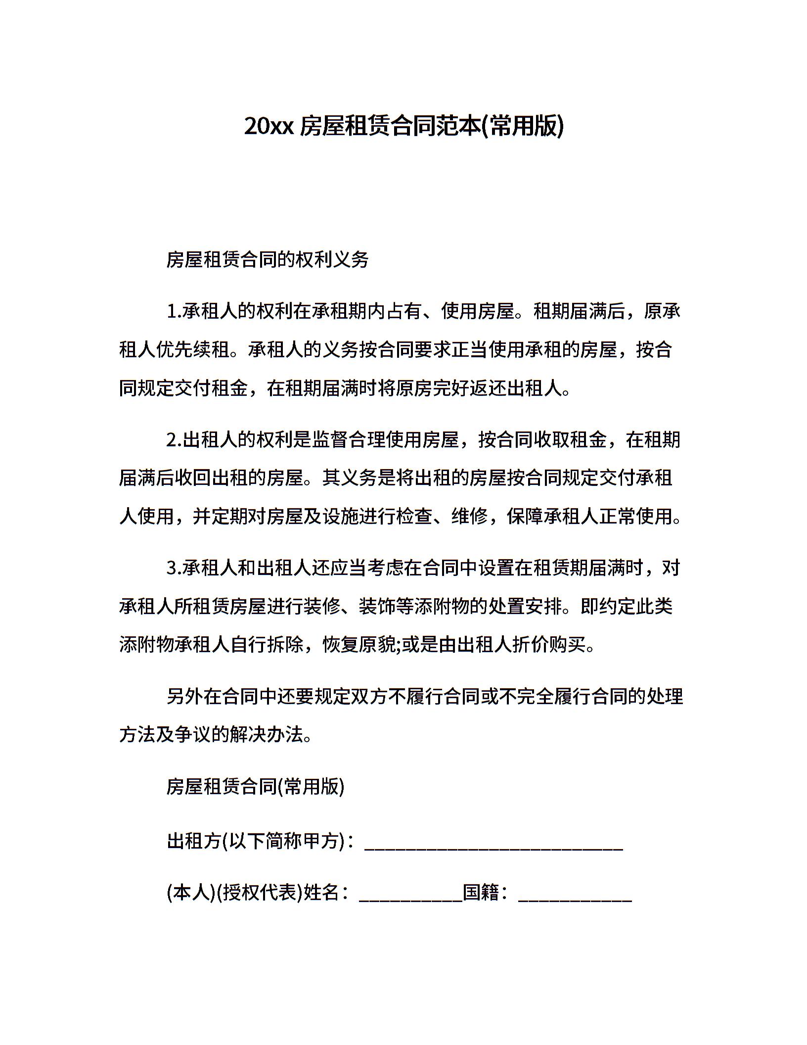 20xx房屋租赁合同范本(常用版)