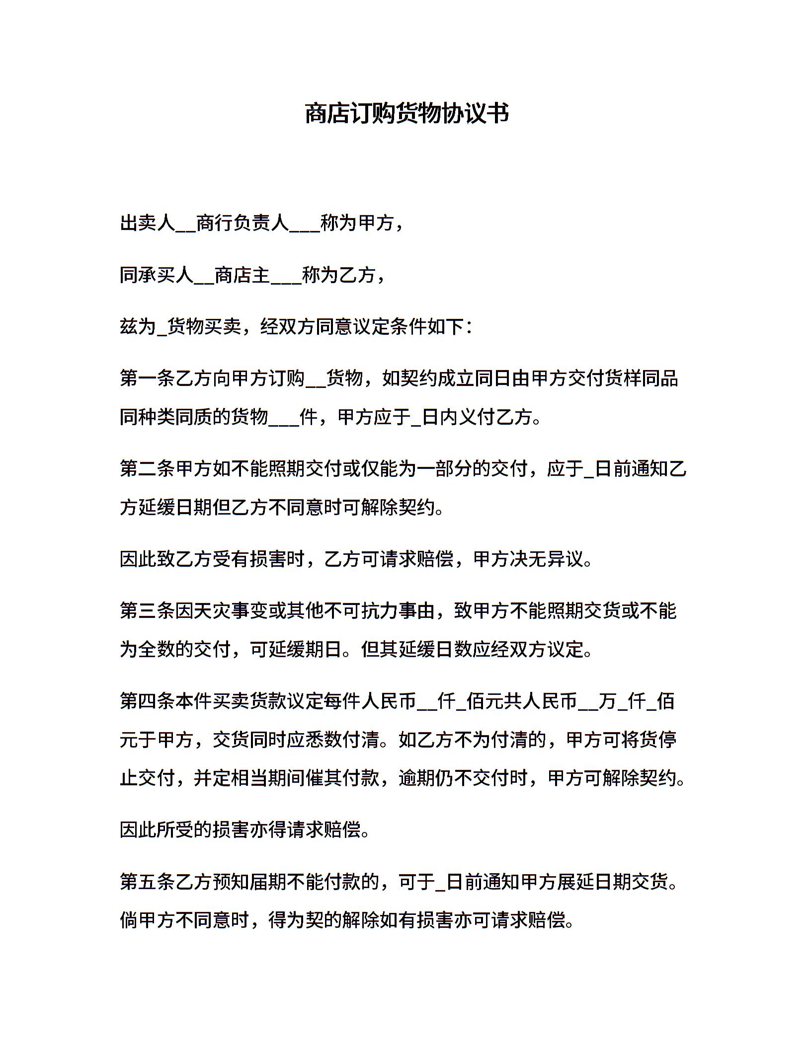 商店订购货物协议书