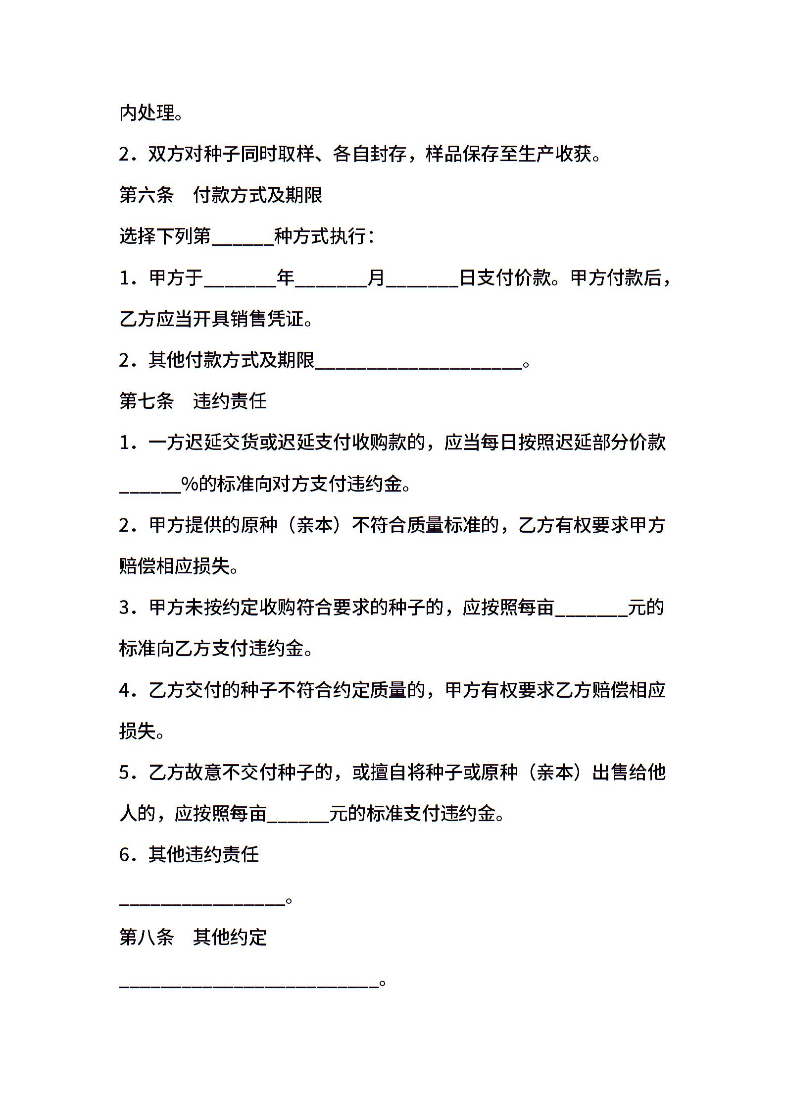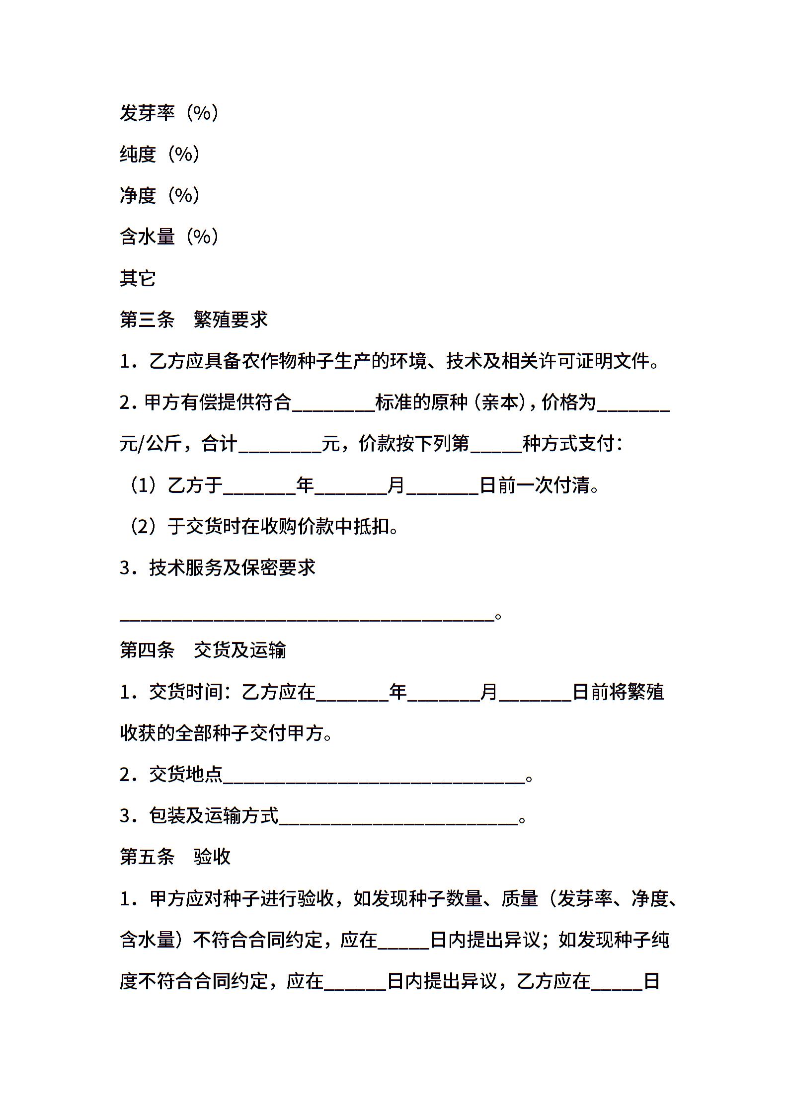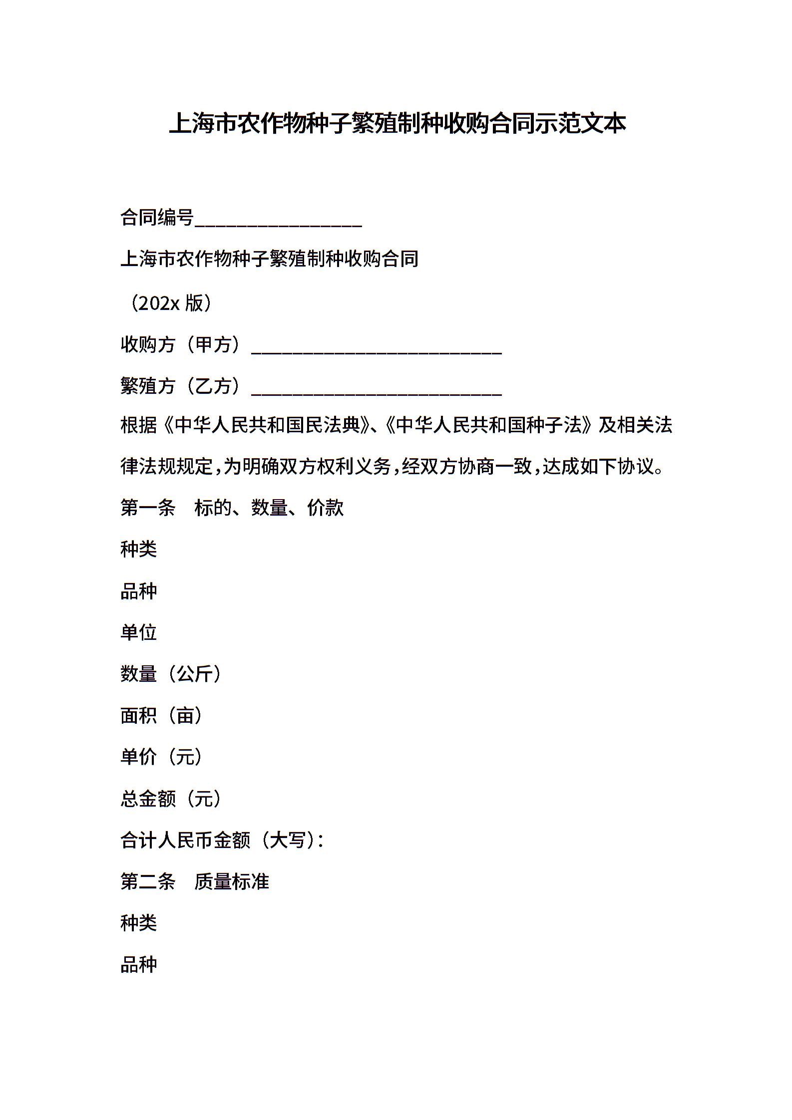 上海市农作物种子繁殖制种收购合同示范文本