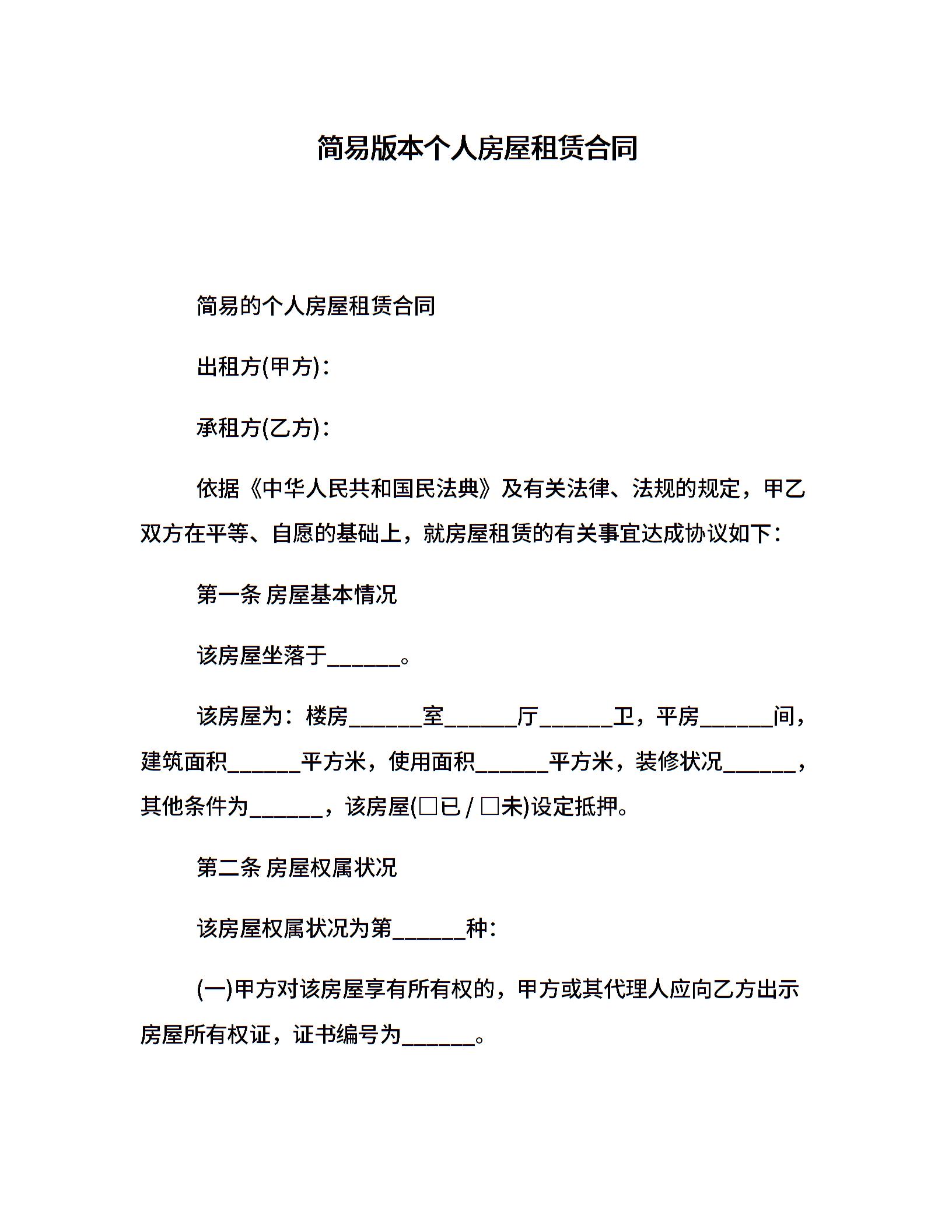 简易版本个人房屋租赁合同
