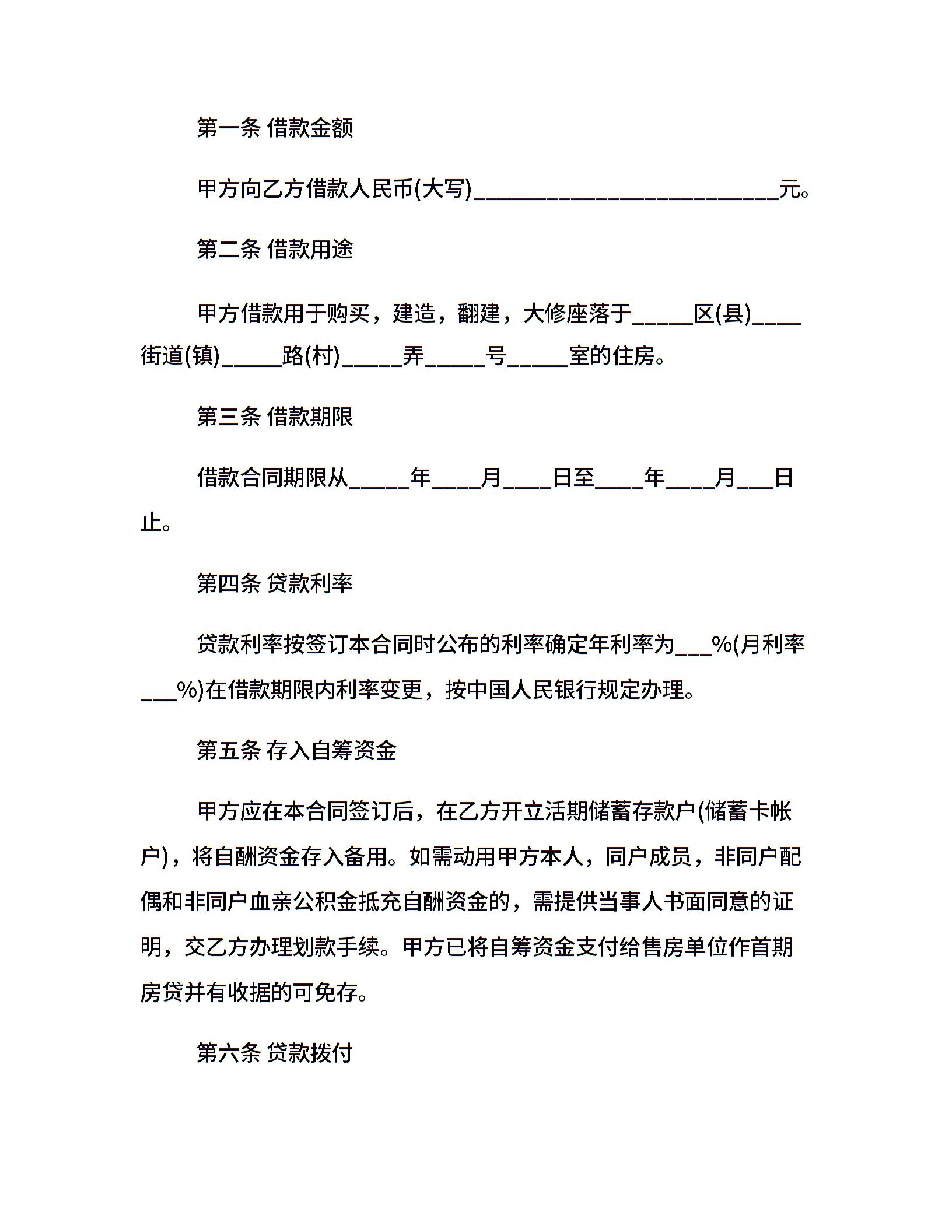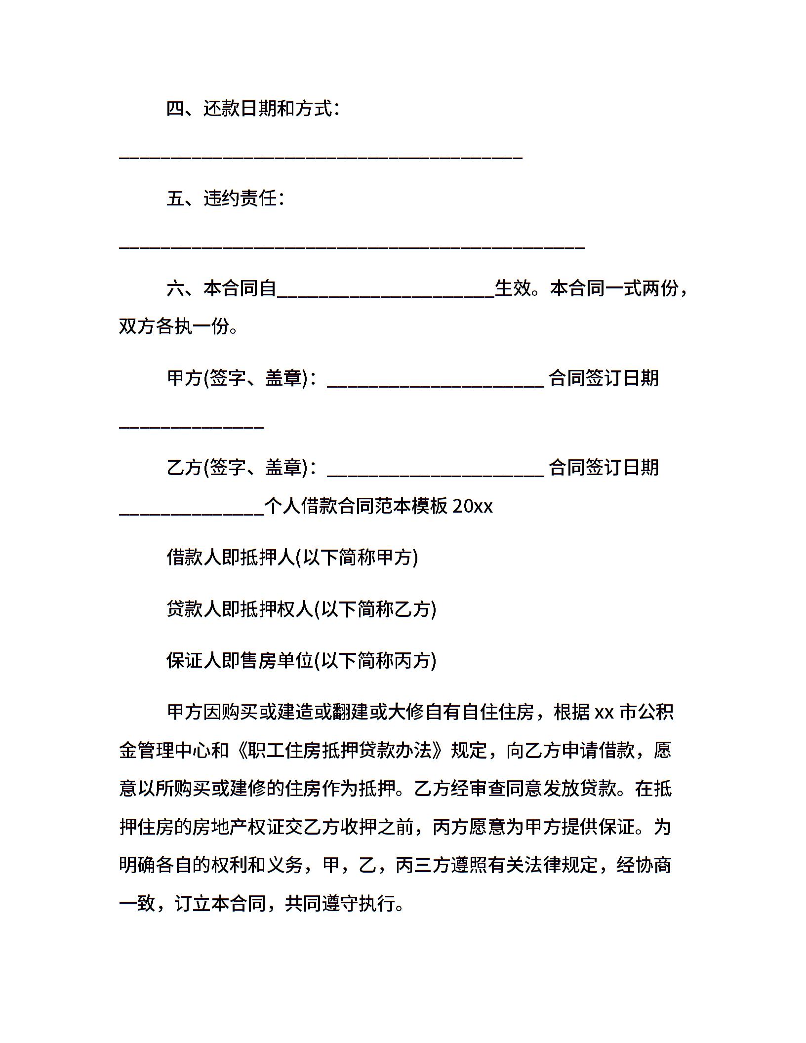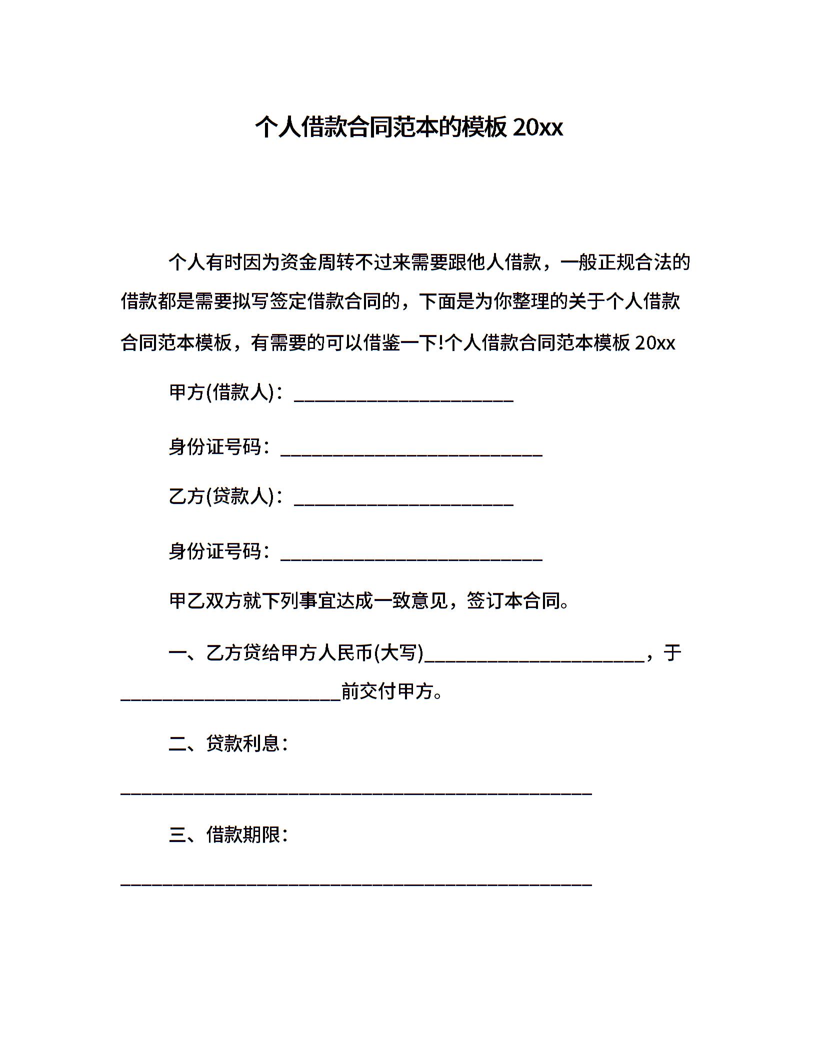 个人借款合同范本的模板20xx