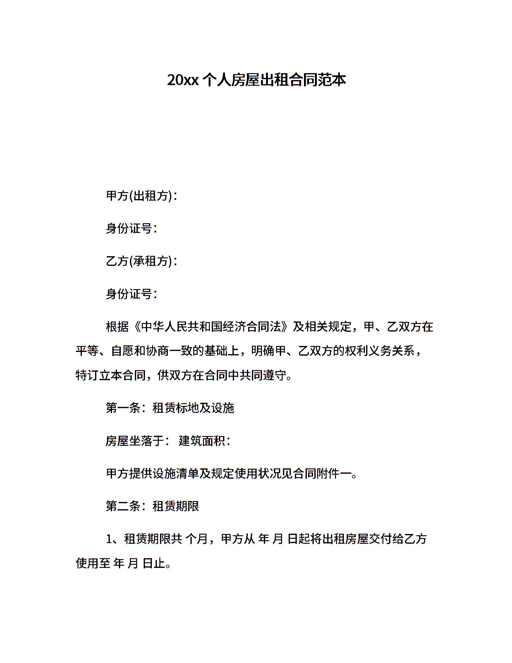 20xx个人房屋出租合同范本