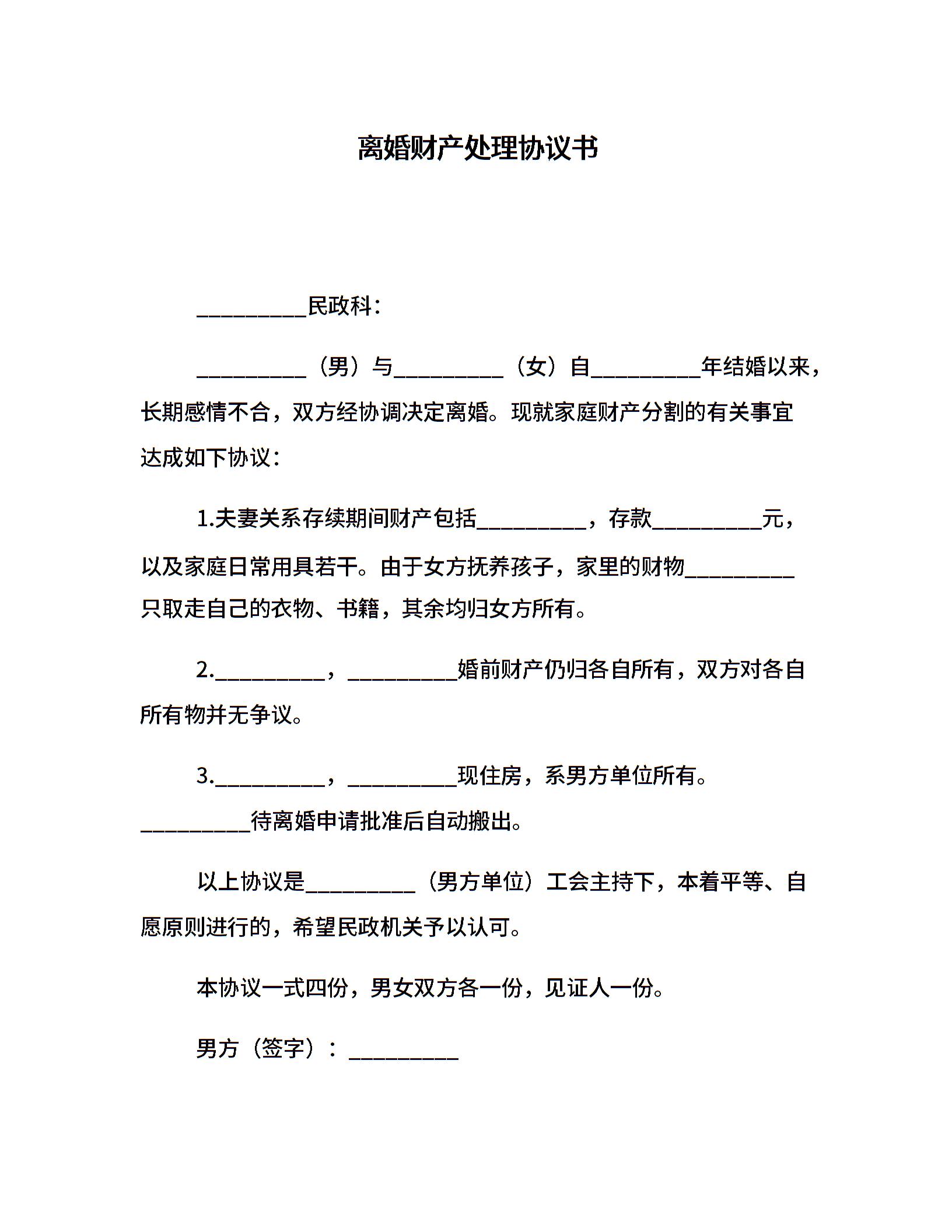 离婚财产处理协议书