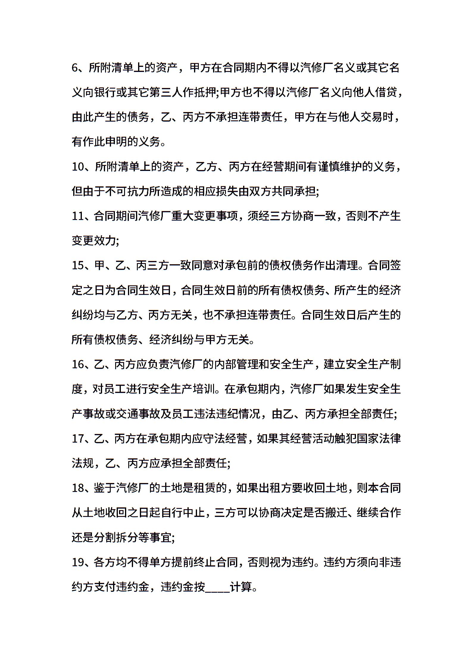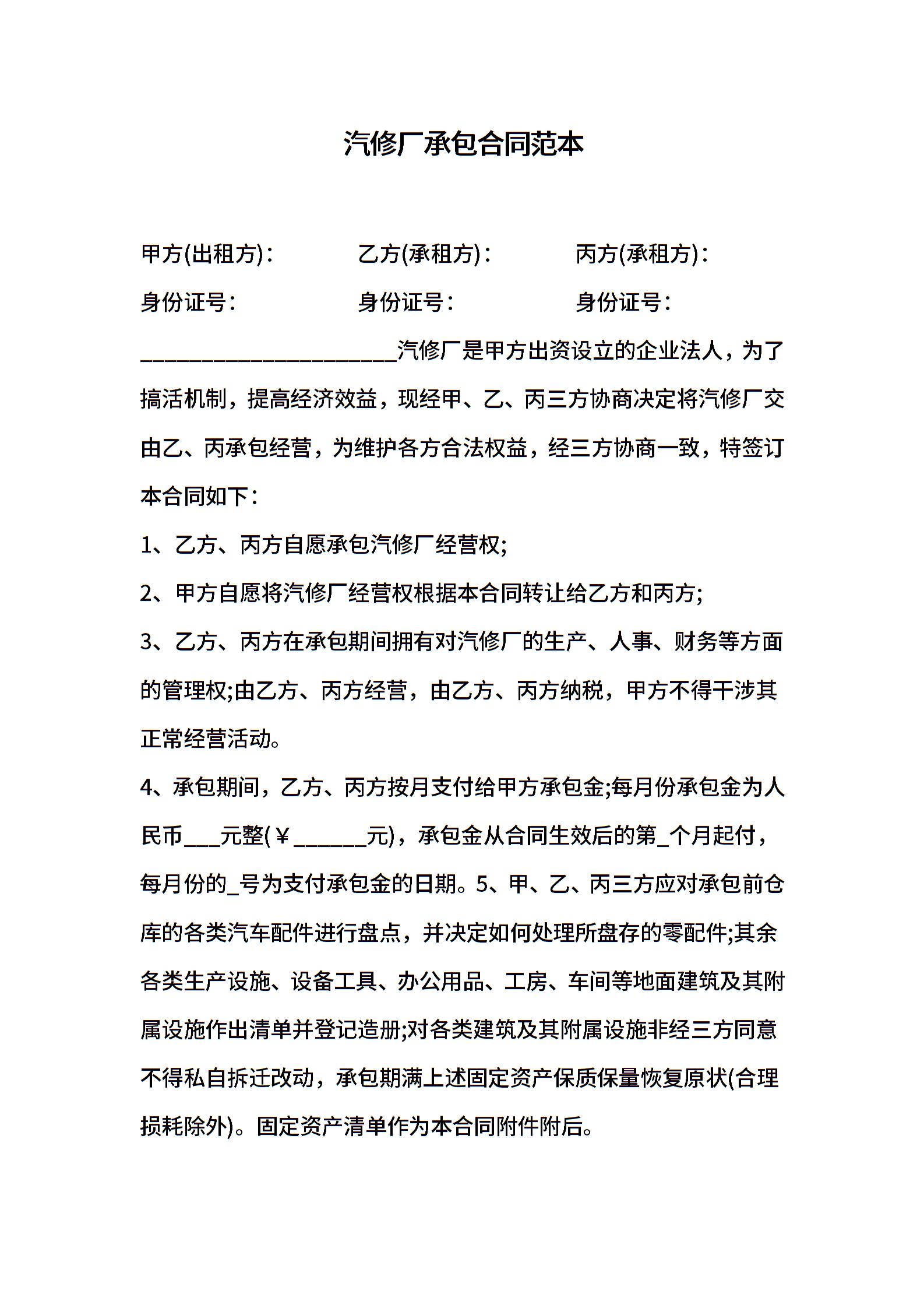 汽修厂承包合同范本