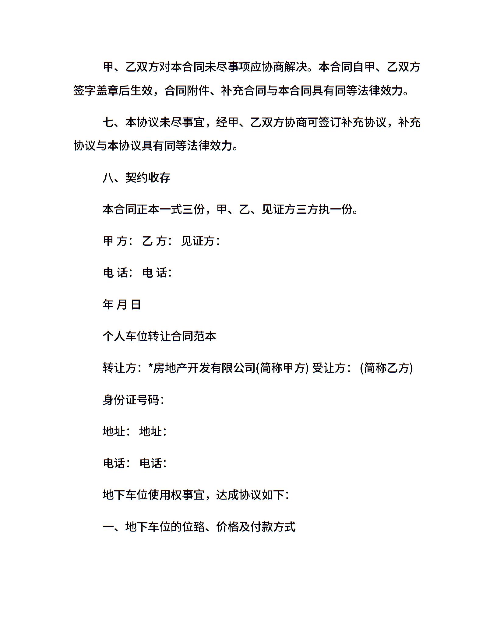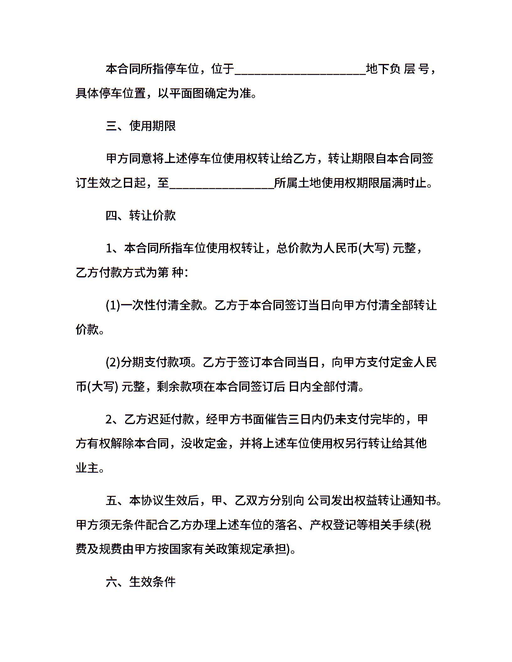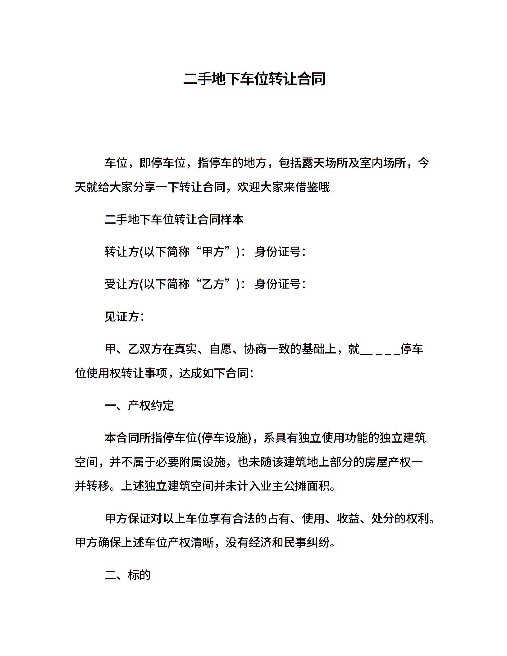 二手地下车位转让合同