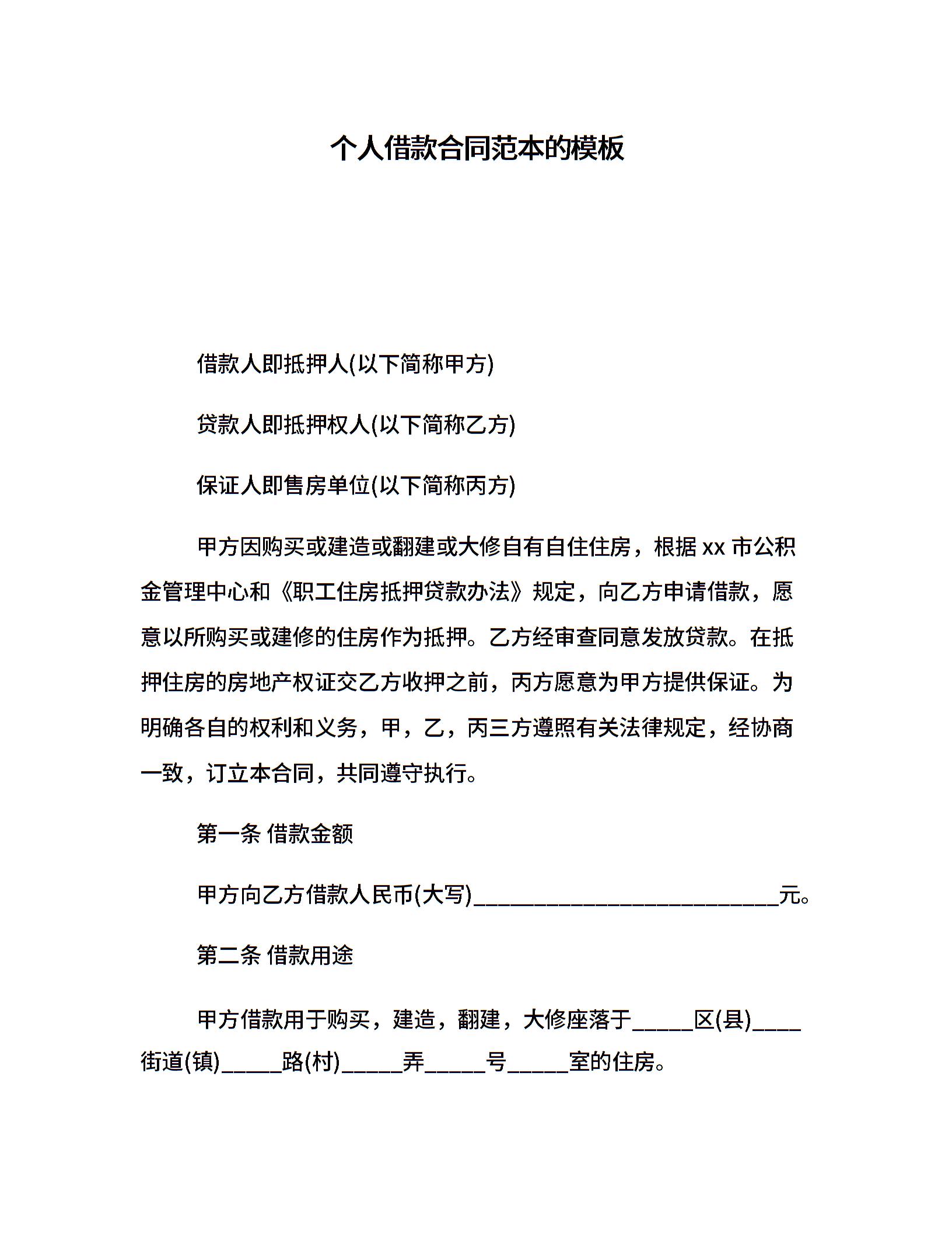 个人借款合同范本的模板