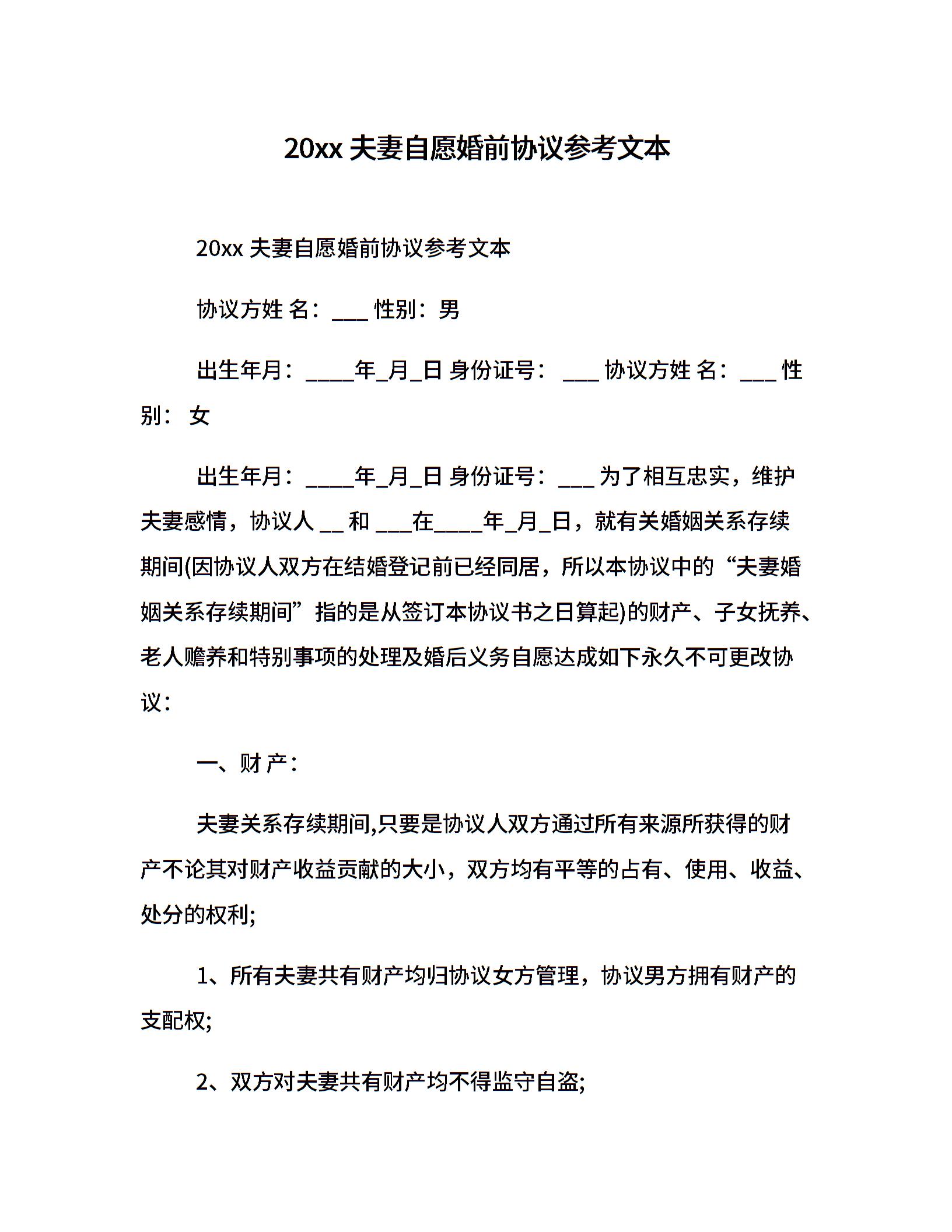 20xx夫妻自愿婚前协议参考文本