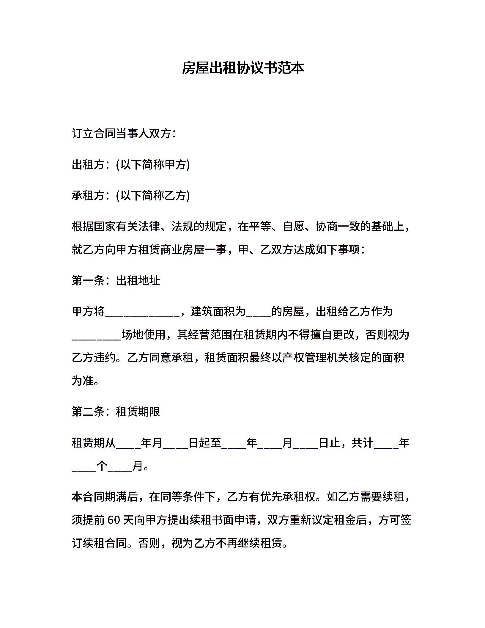 房屋出租协议书范本