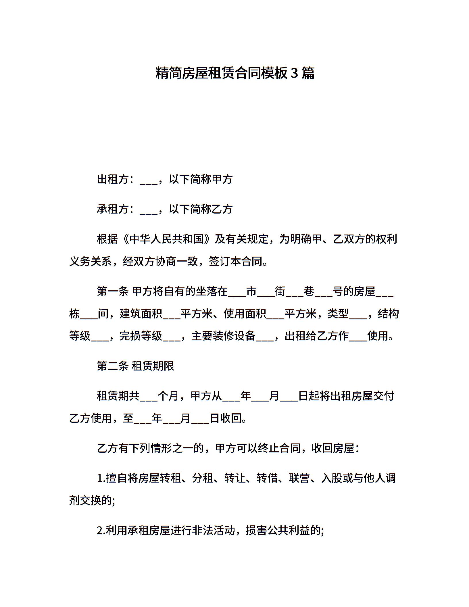 精简房屋租赁合同模板3篇