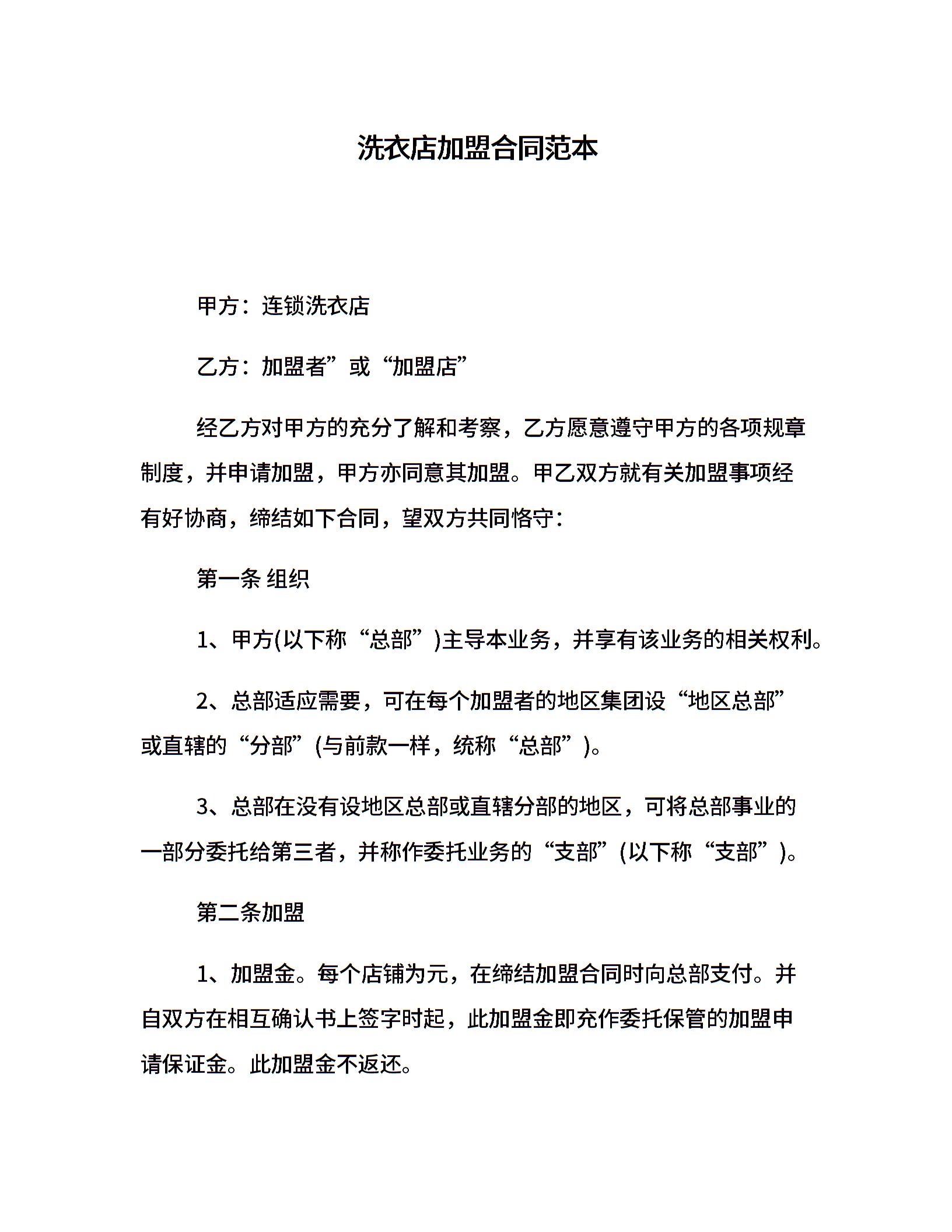 洗衣店加盟合同范本
