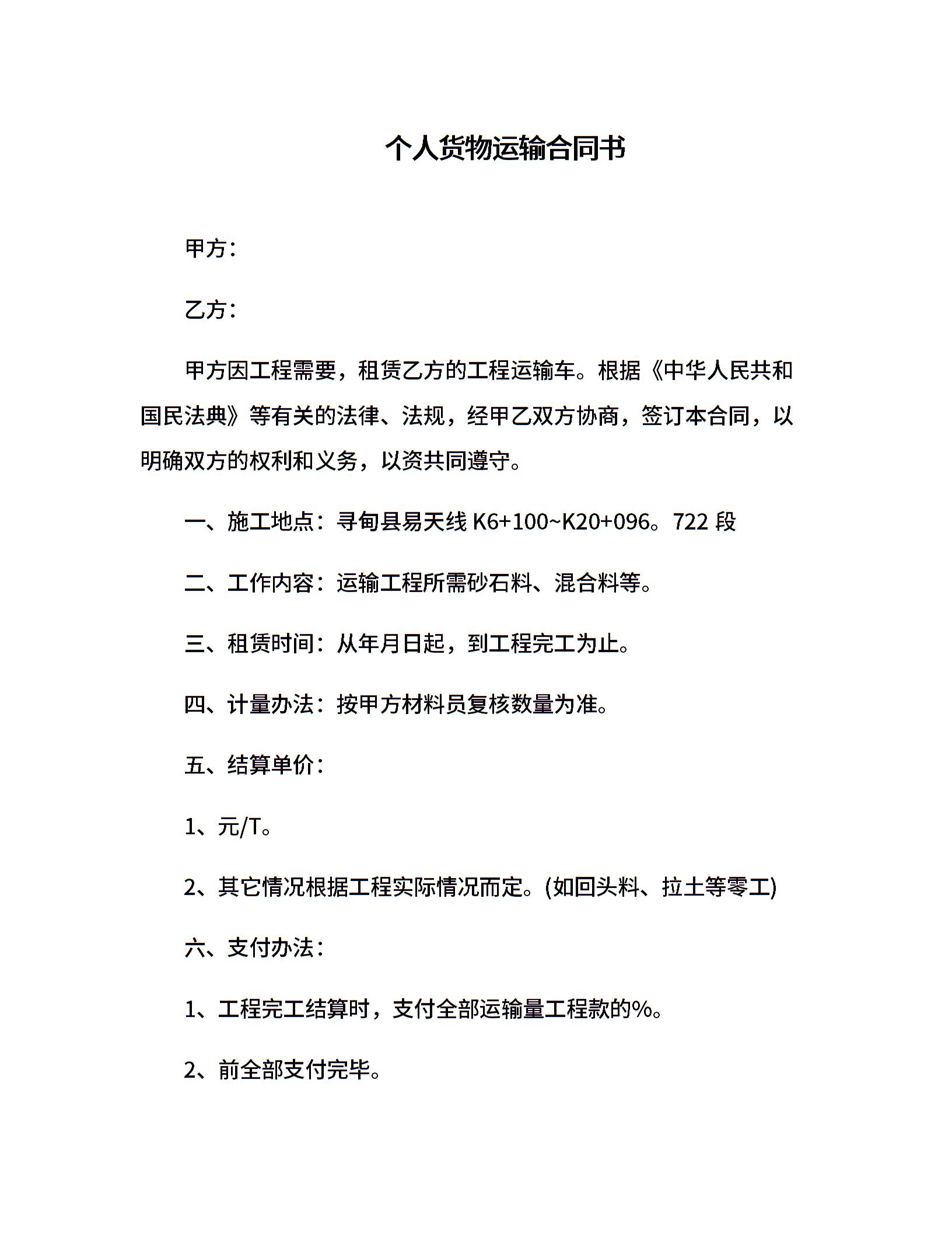 个人货物运输合同书