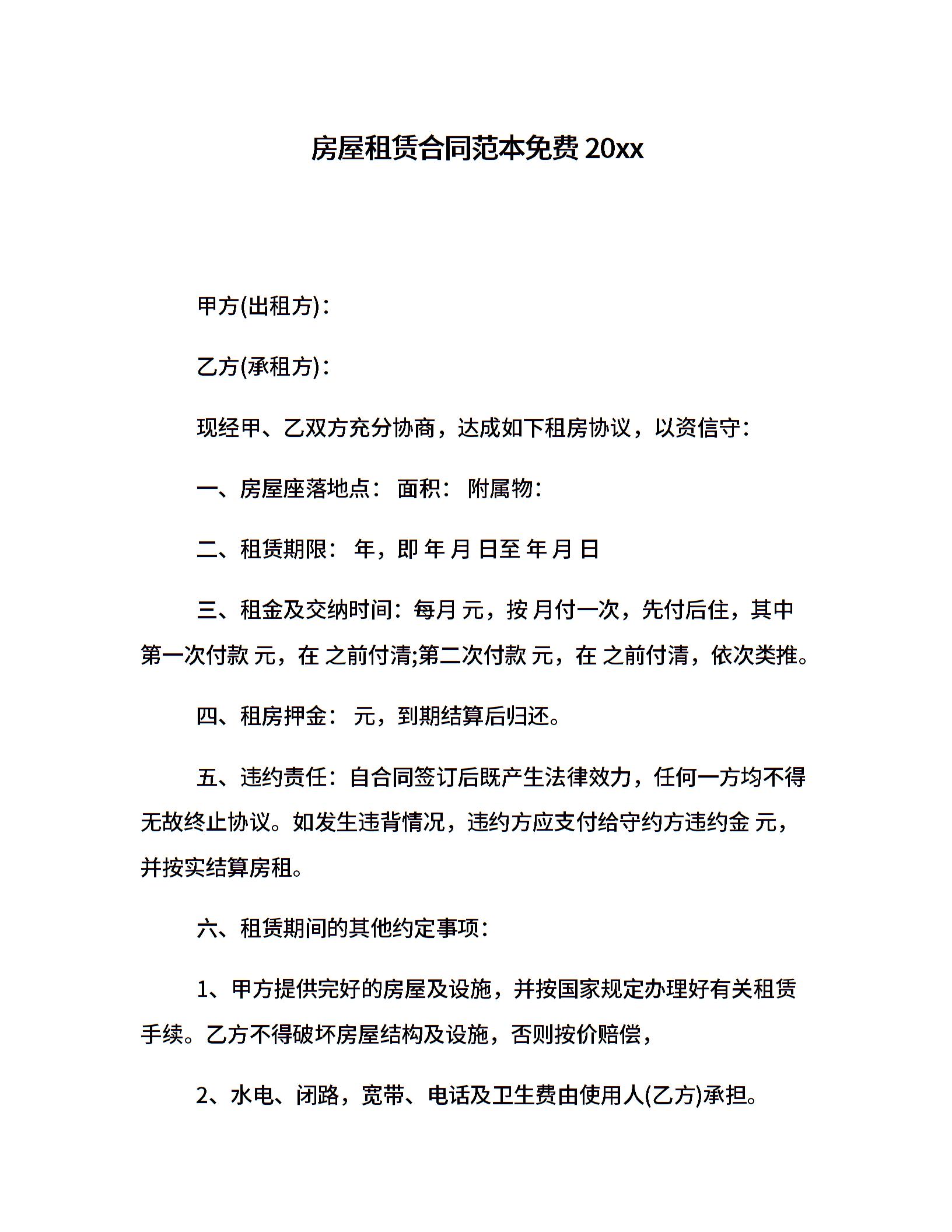 房屋租赁合同范本免费20xx