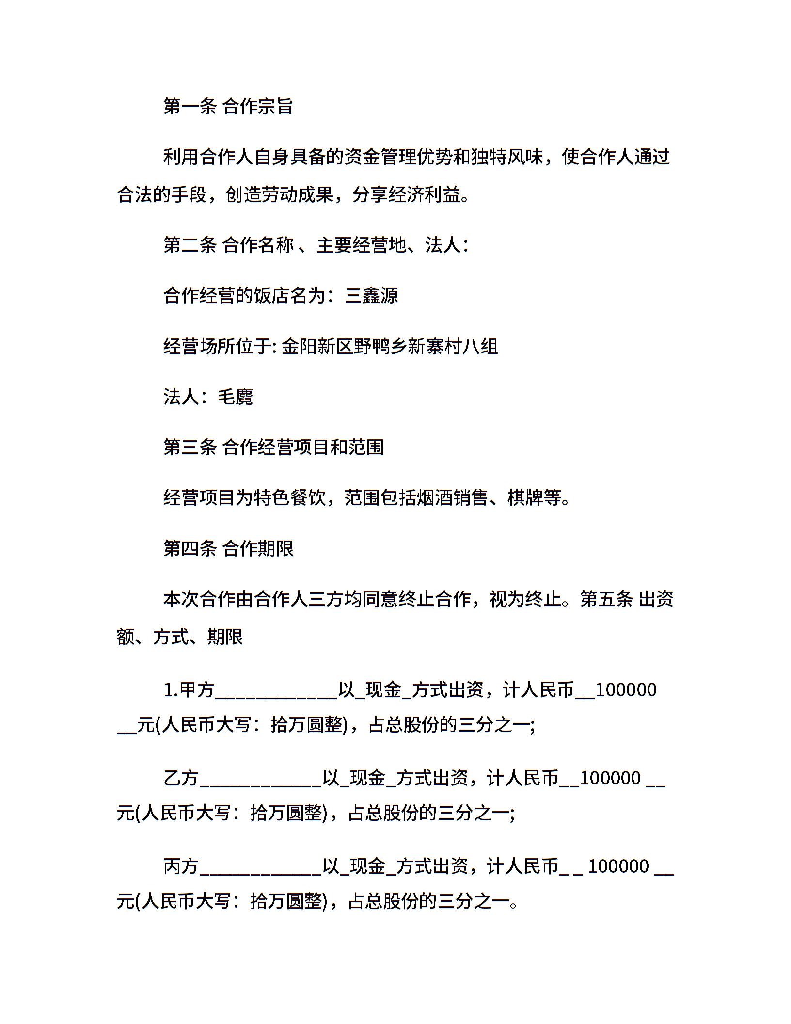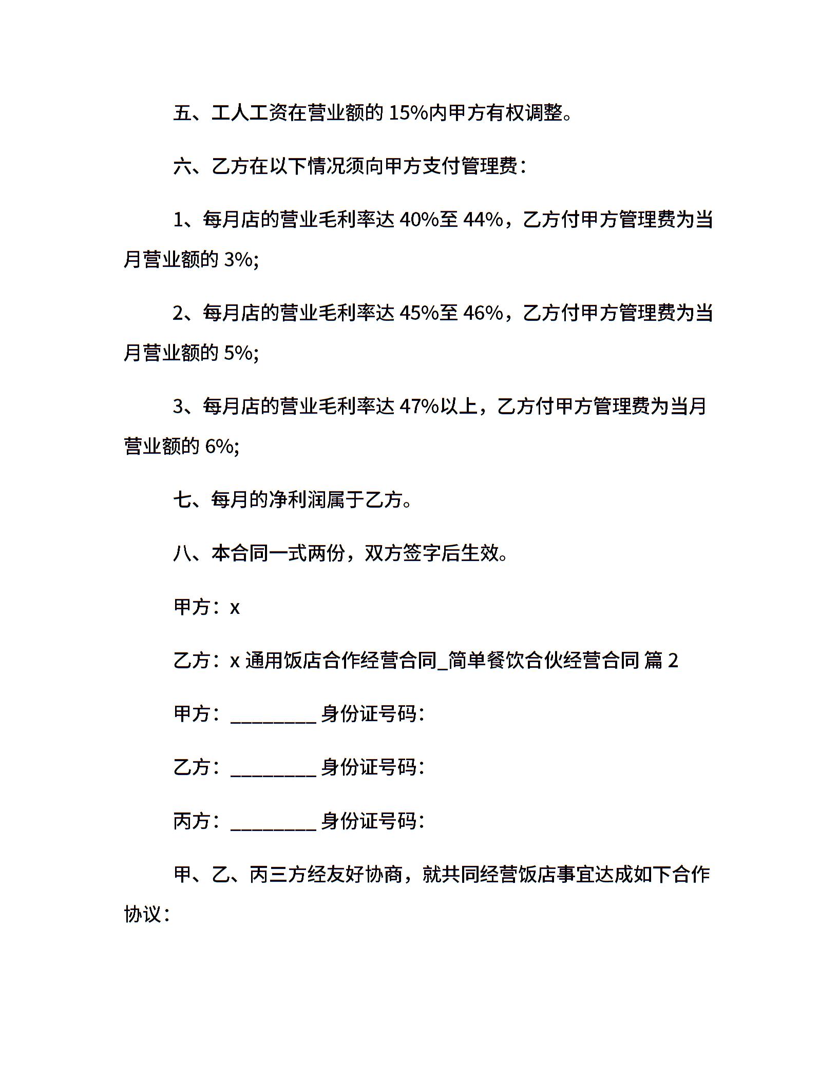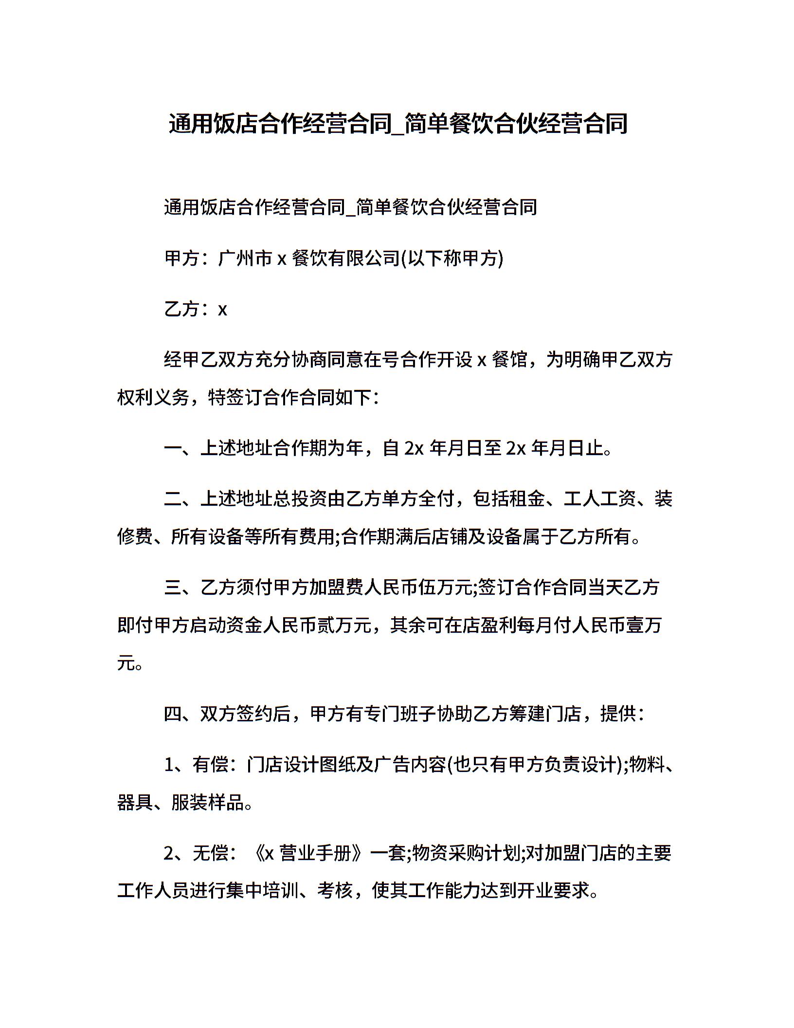 通用饭店合作经营合同_简单餐饮合伙经营合同