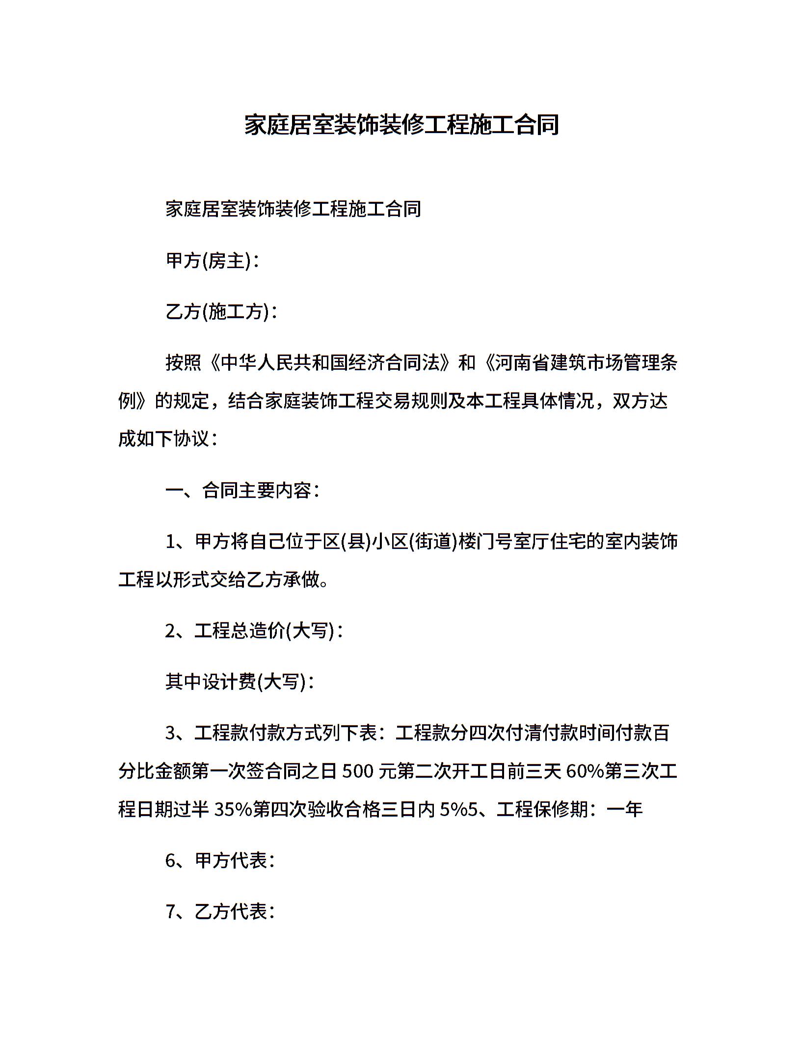 家庭居室装饰装修工程施工合同