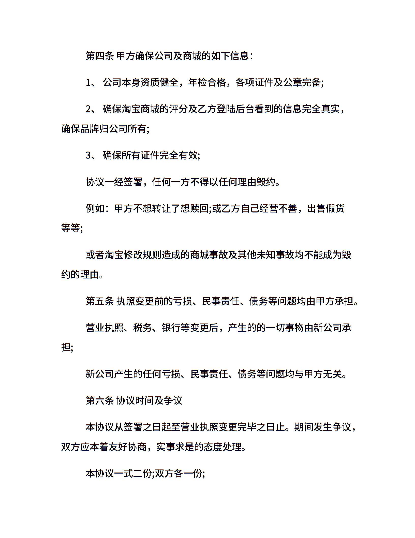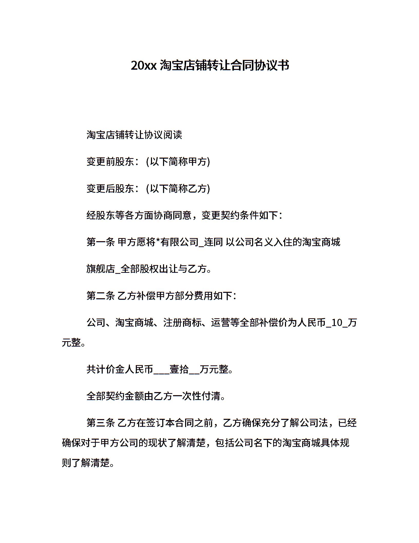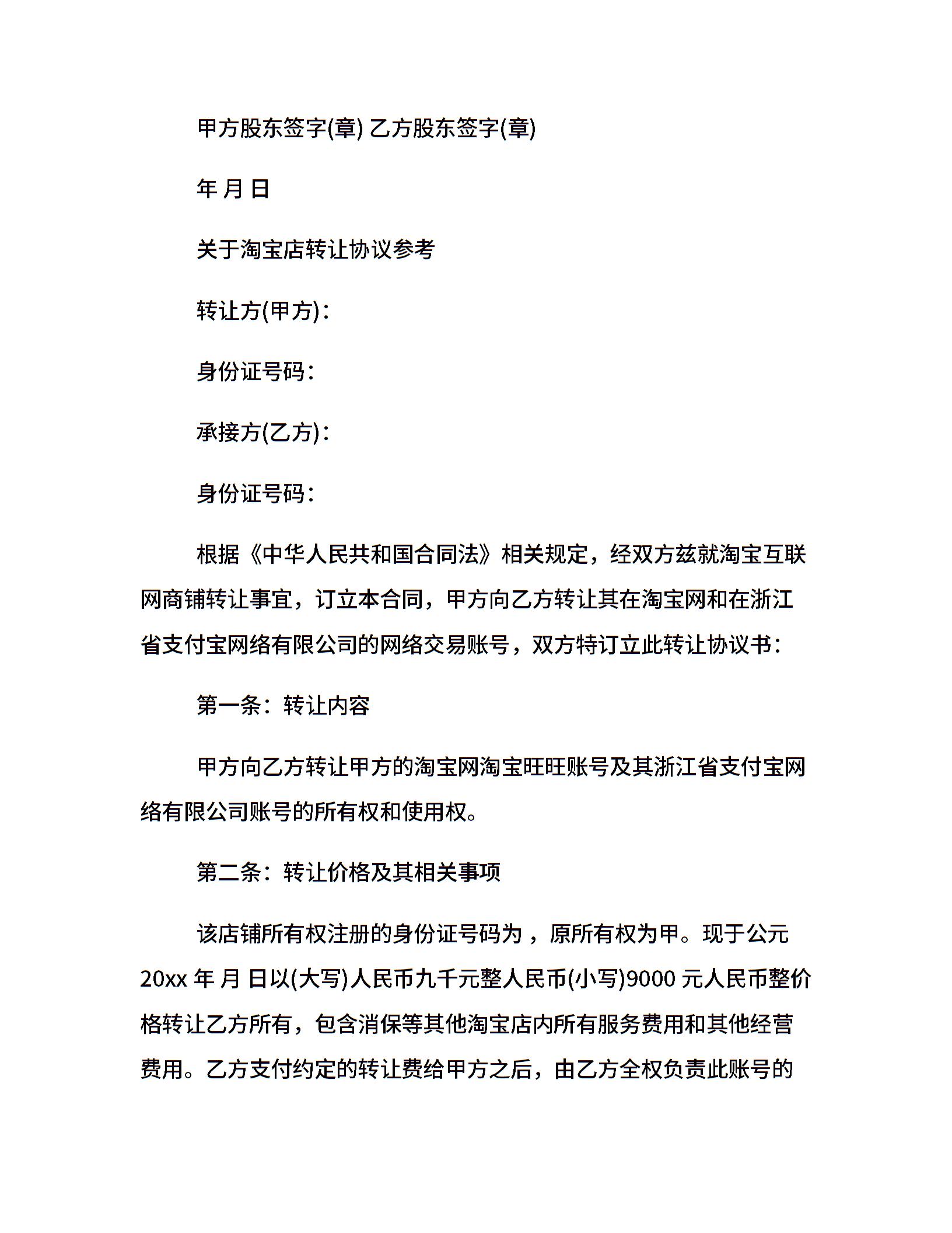 20xx淘宝店铺转让合同协议书