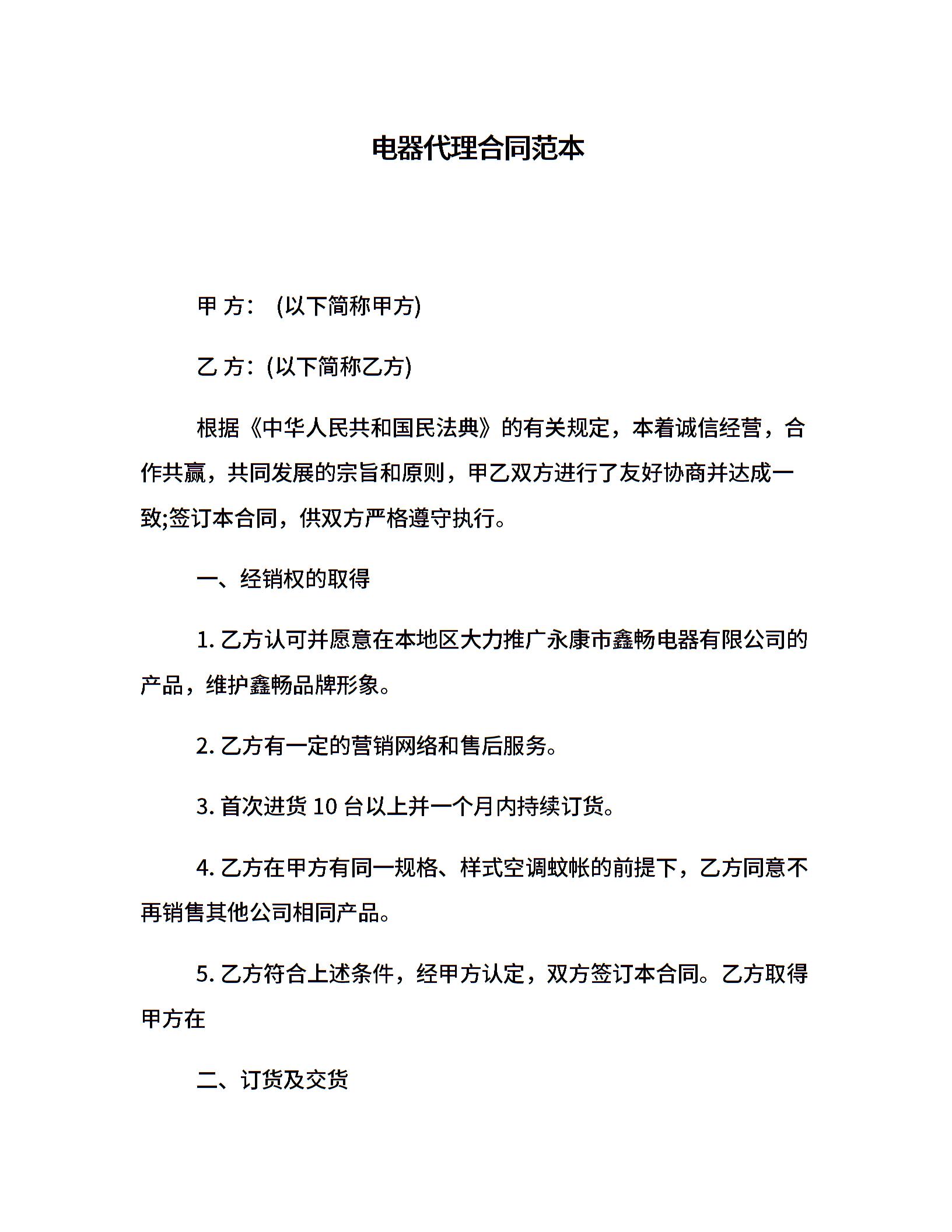 电器代理合同范本